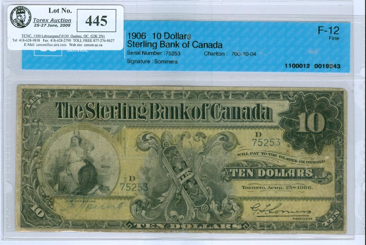 The Sterling Bank of Canada 1906 $10 CH-700-10-04 #75253 CCCS F12. Only 17 examples are known. Scarce.