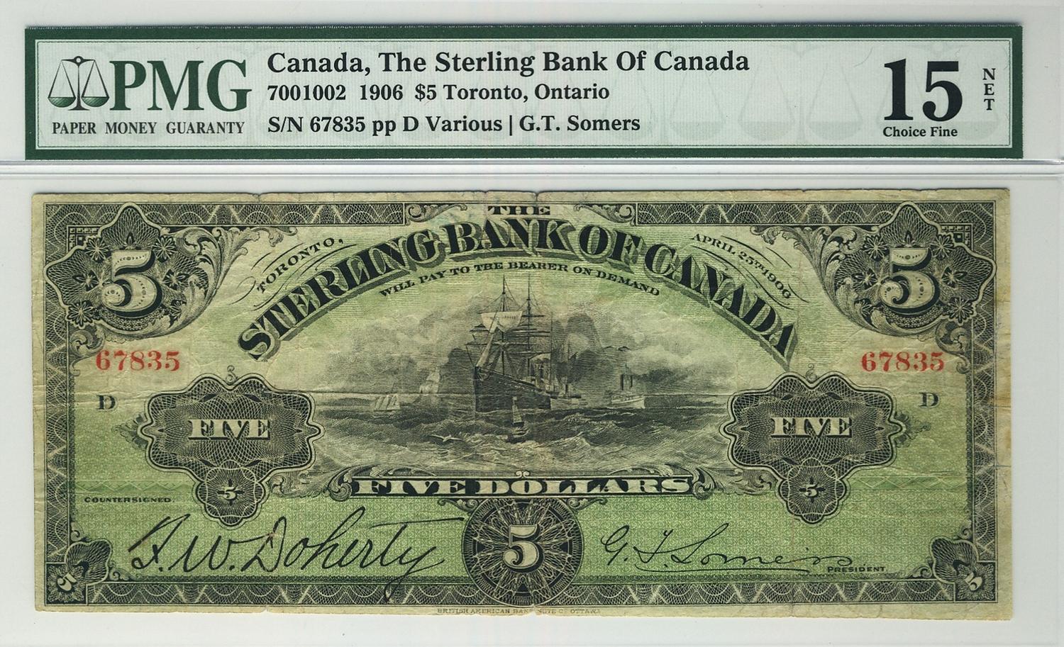 The Sterling Bank of Canada 1906 $5 67835 CH 700-10-02 PMG F15 Net. Only 11 examples known.. Rare