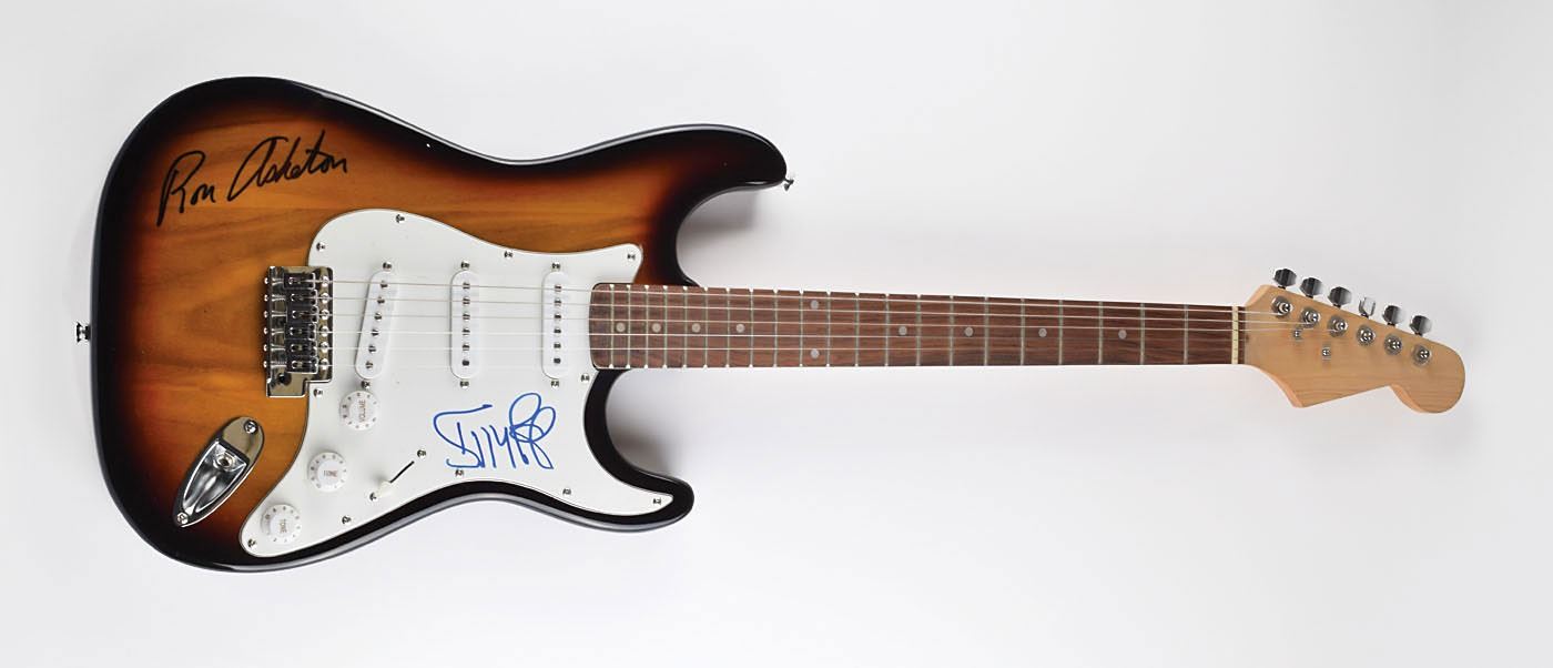 Black-bodied Stratocaster-style electric guitar with a sunburst finish, signed on the white pickguard in blue felt tip by Iggy Pop and on the body in black felt tip by Ron Asheton. In fine condition, with a few dings to back of guitar.