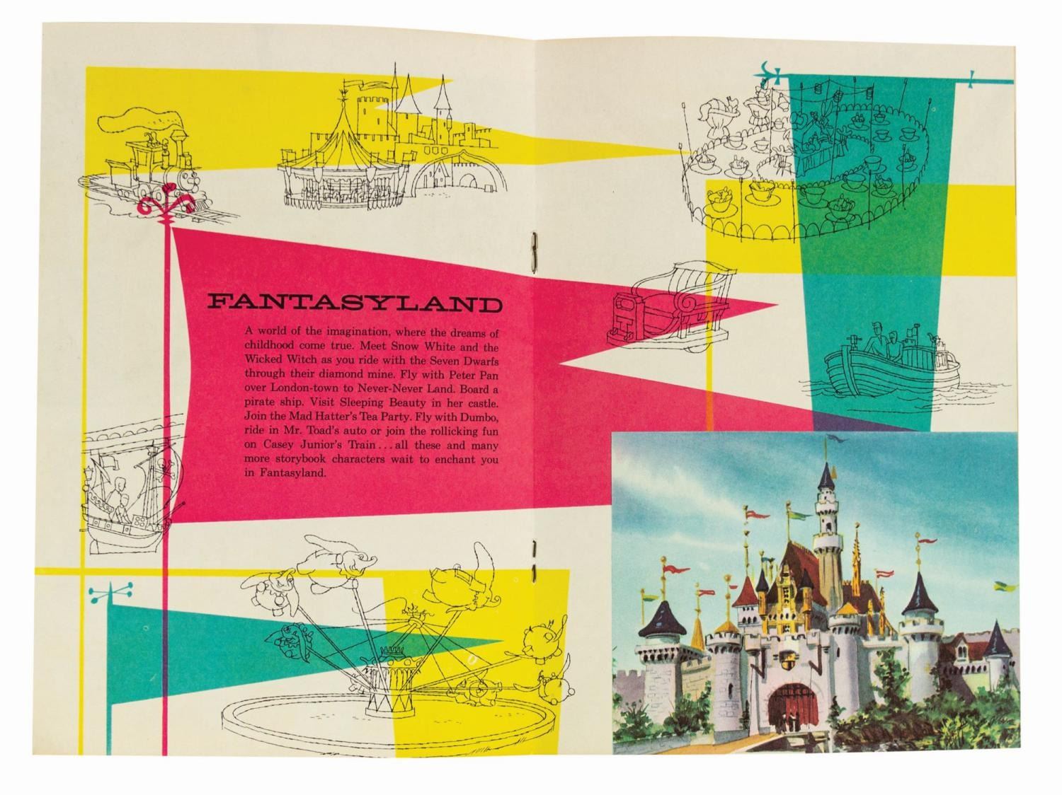 (Disneyland, 1955) A rare Disneyland guidebook created for the park's opening year. The 22-page book is profusely illustrated with concept artwork of the various lands, attractions, and amenities, as the park was still under construction when it was printed. The guidebook measures 8.75"x6" closed and is in fine condition with some spidering along the spine, a faint paperclip impression at the top of the cover and the first page, minor edge toning, and smudging.