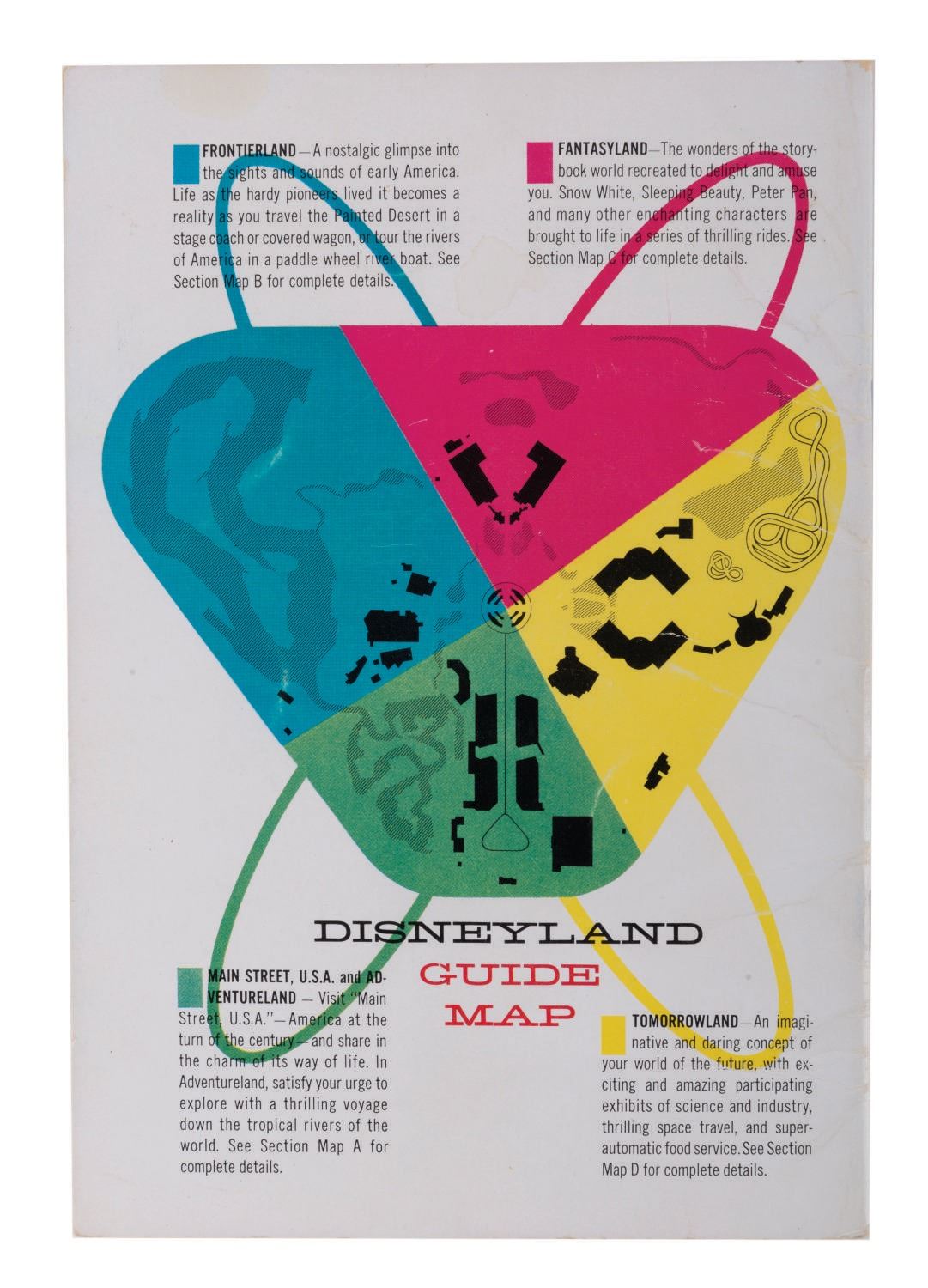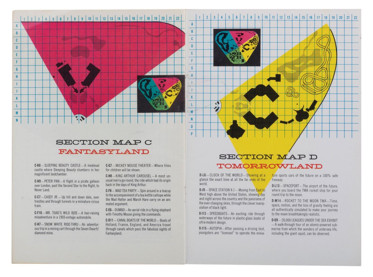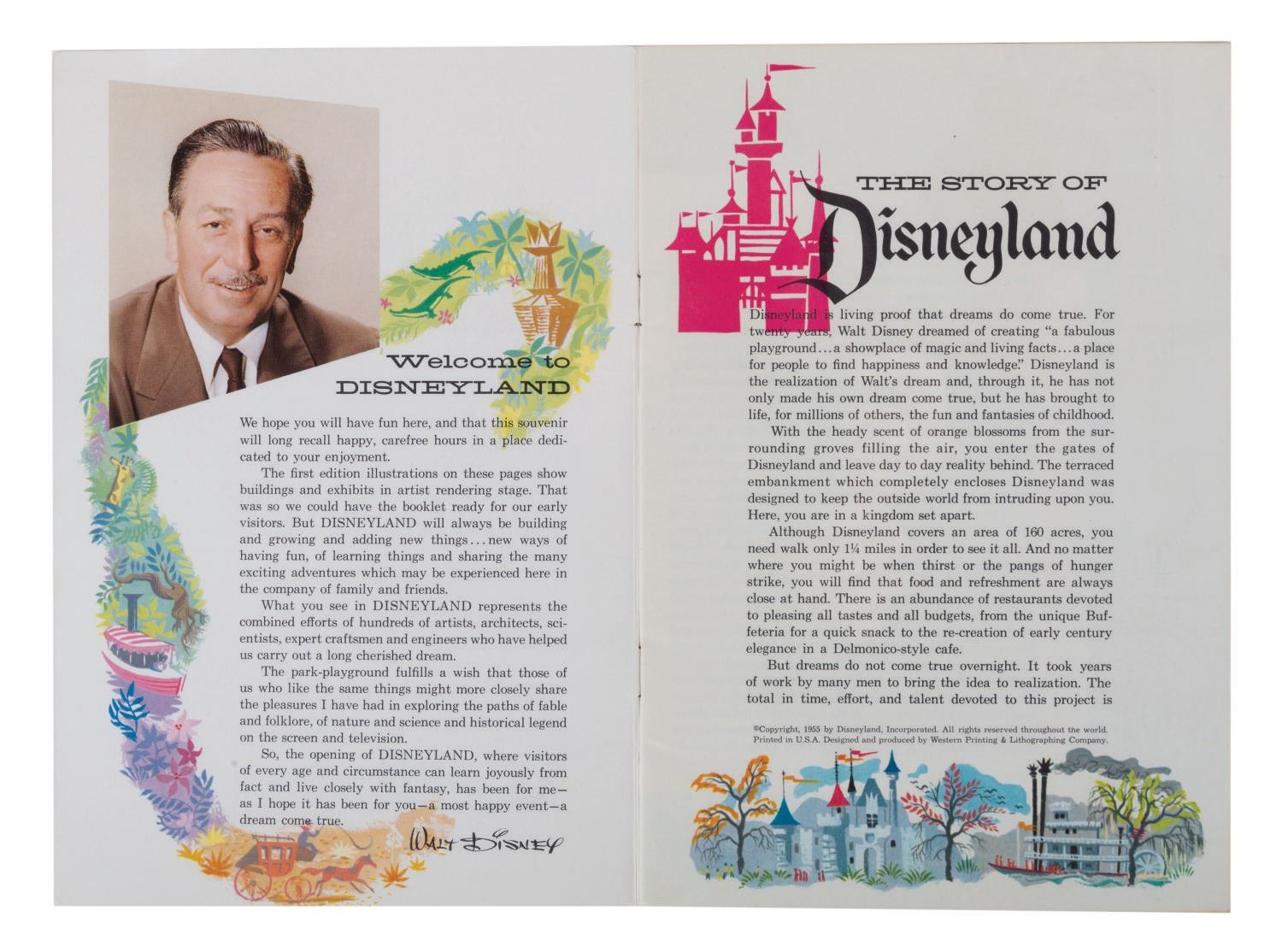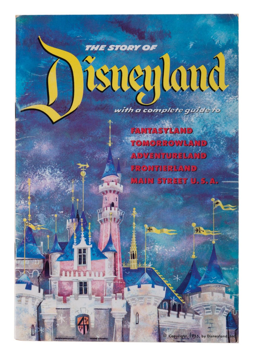 (Disneyland, 1955) A beautiful opening year guidebook with information and illustrations of the different lands of the park. Titled "The Story of Disneyland", this was the first guidebook issued by the Park. Because it had to be published before the opening of the park, the pages are filled with concept art of the attractions and lands, as opposed to later guidebooks which feature photos of the park. This 22-page guidebook measures 8.75"x6" closed, and has interior pages in fine condition, and a cover in very good condition with light wear and creasing along the spine.