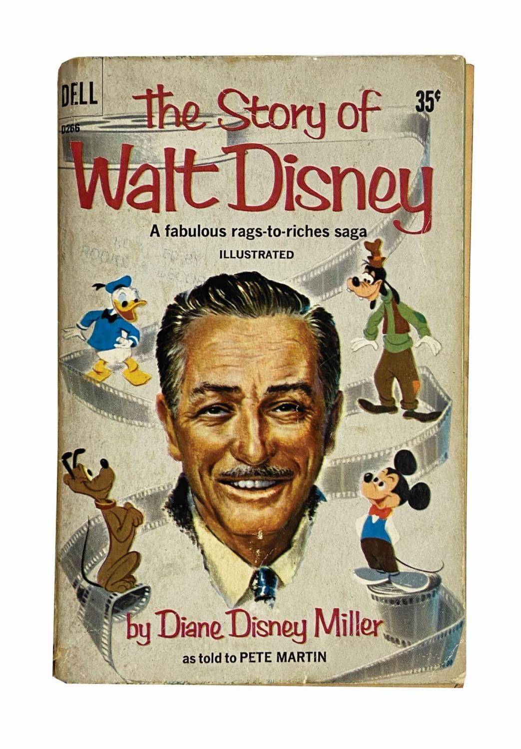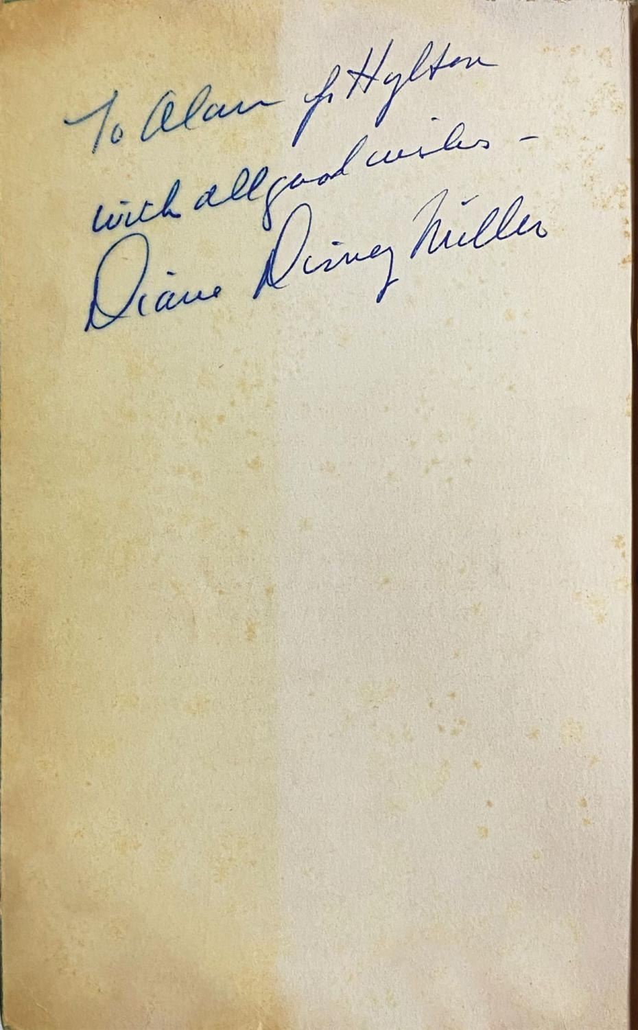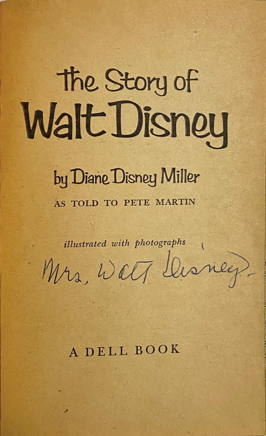 (Dell, 1957) A softcover edition of The Story of Walt Disney, by Walt's daughter, Diane Disney Miller. The 223-page book is signed by both Diane Disney Miller (to Alan Hylton) and by Walt's wife Lillian (as Mrs. Walt Disney). The 6.5"x4.25" book is in fair condition with sections of the pages loos from the spine and areas of discoloration.