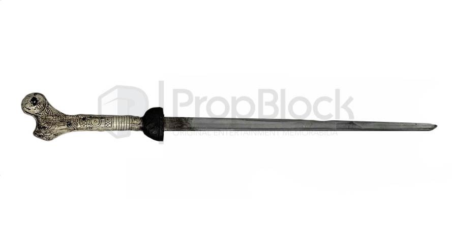 Ornate sword used by the character of Quinlan in the FX series The Strain. This sword features a bone style handle with carved detailing and a plastic sword blade made for the actors safety on set. This piece remains in excellent, production used condition.