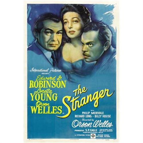 <B>The Stranger (RKO, 1946).</B></I> One Sheet (27" X 41"). Orson Welles directed and starred in this thriller set in a small New England town. Welles is a Nazi war criminal hiding in America and seeking to kill other ex-Nazis who could expose his past. The poster for this film is absolutely stunning and is a favorite among <I>noir</B></I> enthusiasts. This one sheet had tiny chips and cross fold tears along the fold lines, with a bit more work required on the upper vertical section and at the center points. There were pinholes and tears in the corners and some chipping on the upper corners as well. The borders have been airbrushed to render the poster quite presentable. Fine- on Linen. <BR><BR><b>Shipping:</b> Rolled Material (<a target="_blank" href="http://www.heritageauctions.com/common/shipping.php">view shipping information</a>)