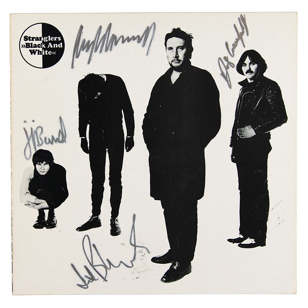 A 1981 EMI Electrola vinyl pressing of The Stranglers album Black and White, signed on the front cover in silver ink by Hugh Cornwell, Dave Greenfield, Jean Jaques Burnel, and Jet Black. In fine condition, with light feathering to the signatures. The record is included. Accompanied by a certificate of authenticity from Tracks.