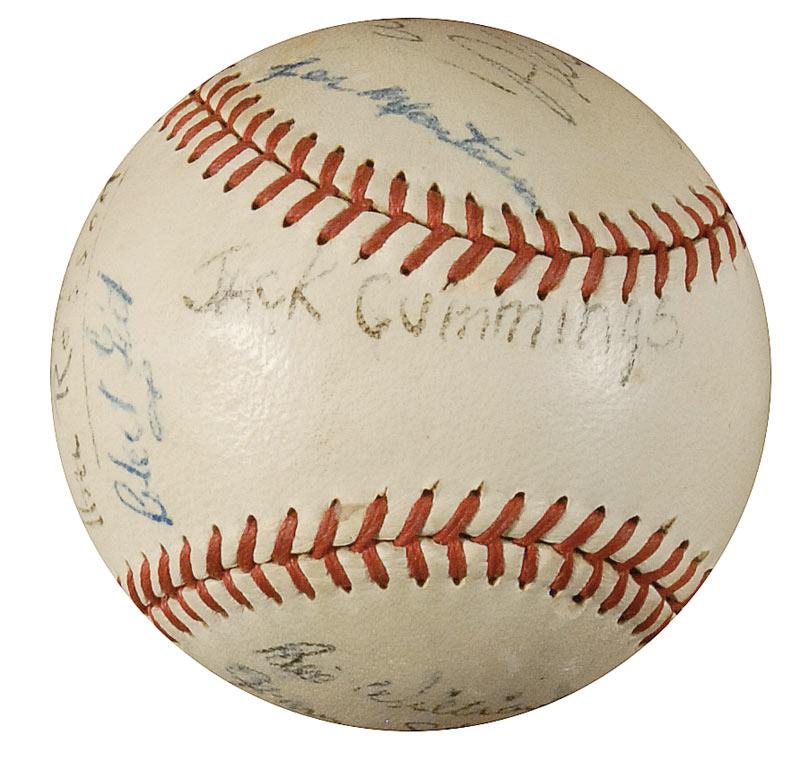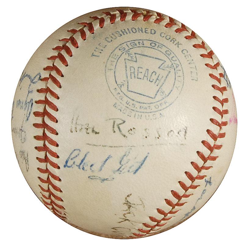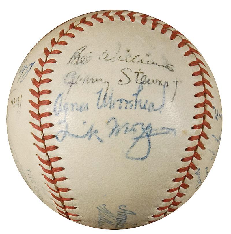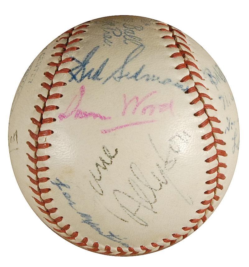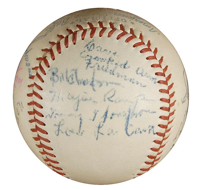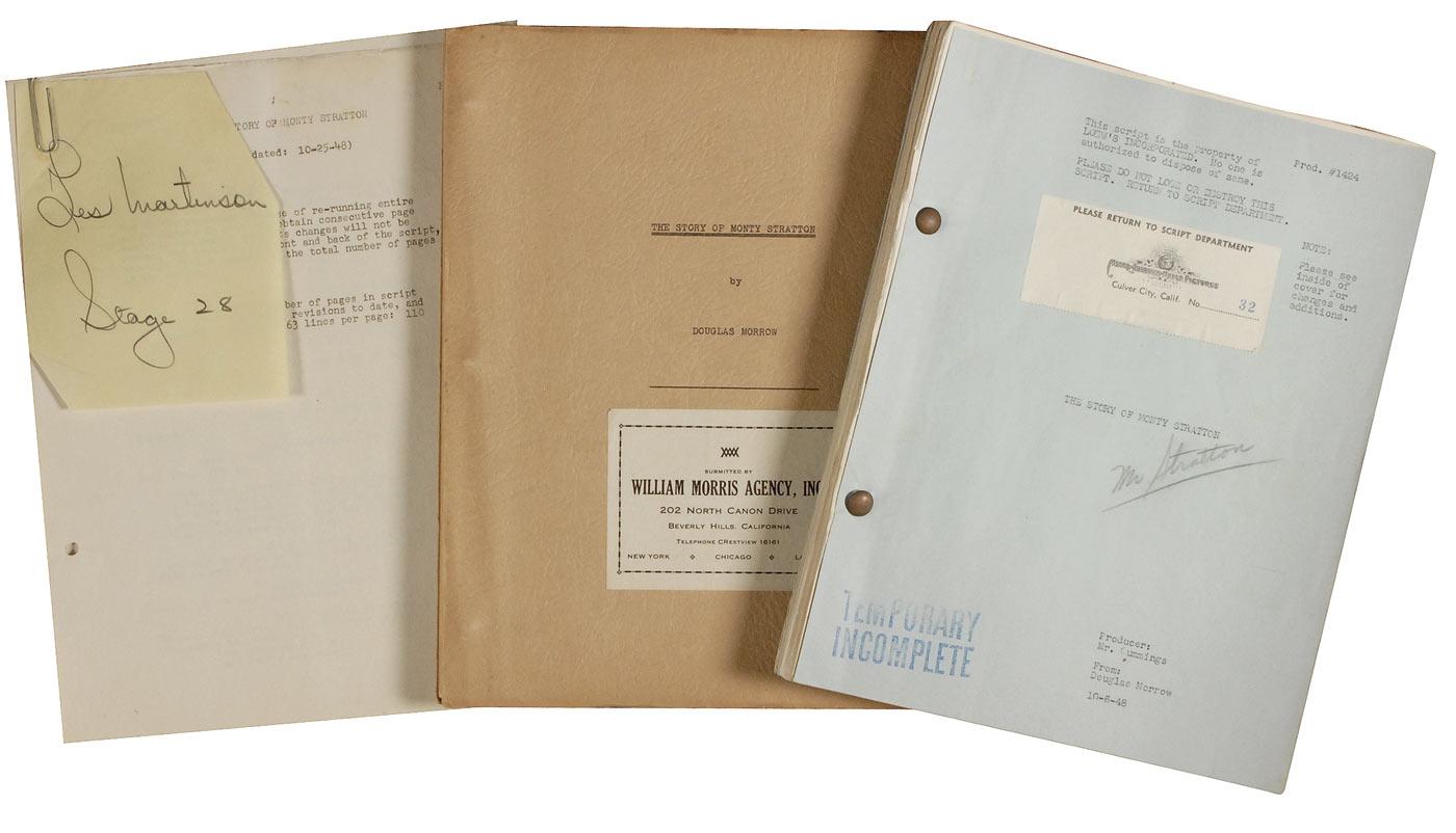 Official Reach American League baseball signed in various color ballpoint and ink by The Stratton Story’s James Stewart, June Allyson, Agnes Moorehead, Frank Morgan, director Frank Wood, producer Jack Cummings, and several other cast and crew members. Some scattered light toning, a bit of light skipping to a couple of signatures, and a few fingerprint brushes to a some of the signatures, otherwise fine condition. Also included are two scripts for the film, dated October 6 and October 25, 1948, and a 56-page treatment.