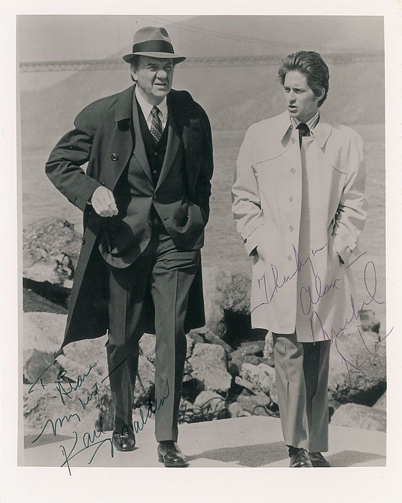 Glossy 8 x 10 photo of detectives Mike Stone and Steve Keller, signed and inscribed in black felt tip, “To Alan, My best—Karl Malden,” and signed and inscribed in black ballpoint, “Thank you Alan—Michael Douglas.” In fine condition.