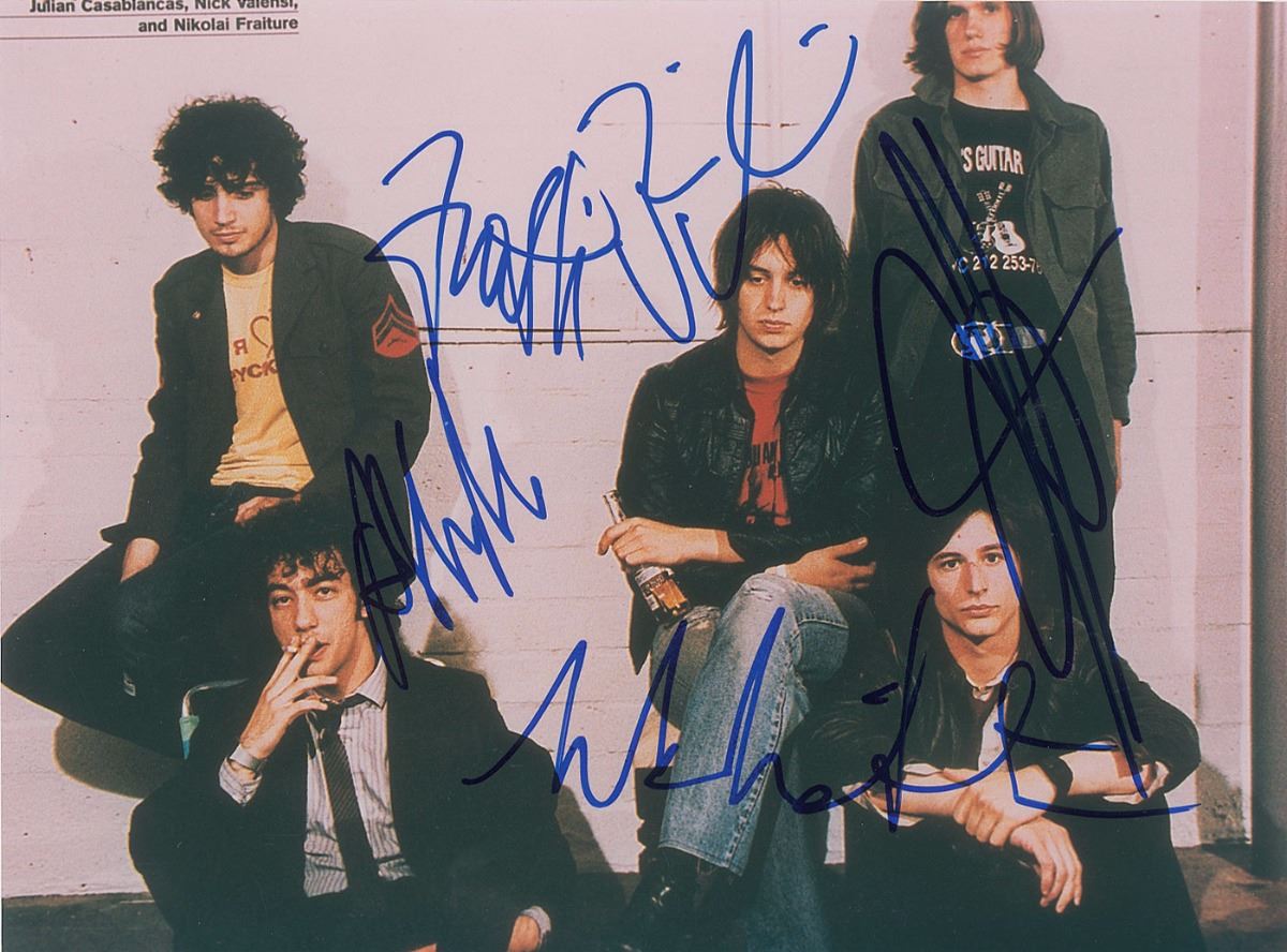 Color glossy 10.75 x 8 photo of The Strokes, signed in blue felt tip by Julian Casablancas, Nick Valensi, Albert Hammond, Jr., Nikolai Fraiture, and Fabrizio Moretti. In fine condition.