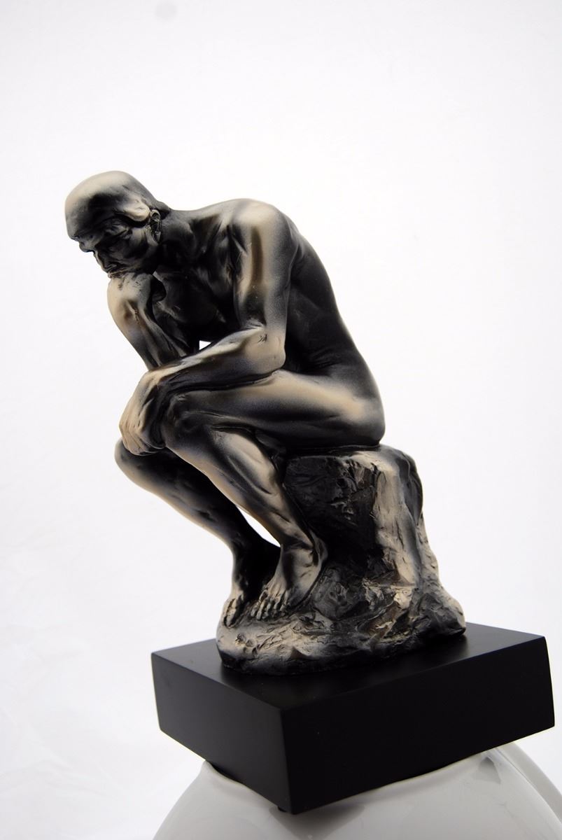 The 9" sculpture of The Thinker is part of Auguste Rodin's great work, Gate to Hell. The Thinker is one of the best known sculptures in the world. This piece is all black made of durable polyresin.Size: 9X11X17