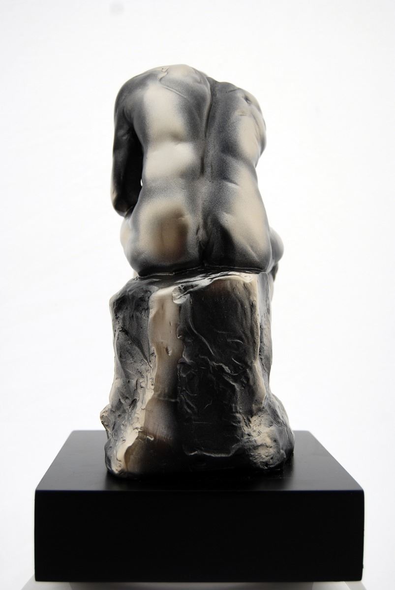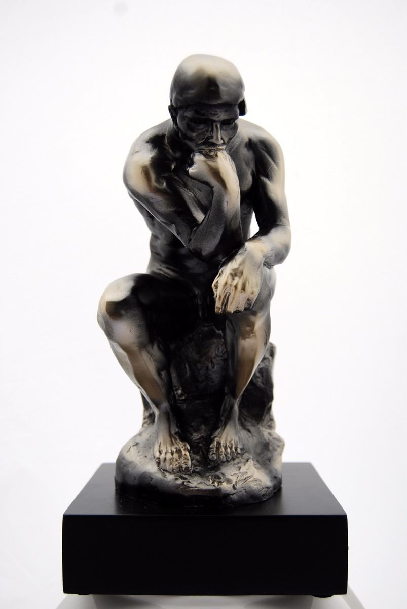 The 9" sculpture of The Thinker is part of Auguste Rodin's great work, Gate to Hell. The Thinker is one of the best known sculptures in the world. This piece is all black made of durable polyresin.Size: 9X11X17