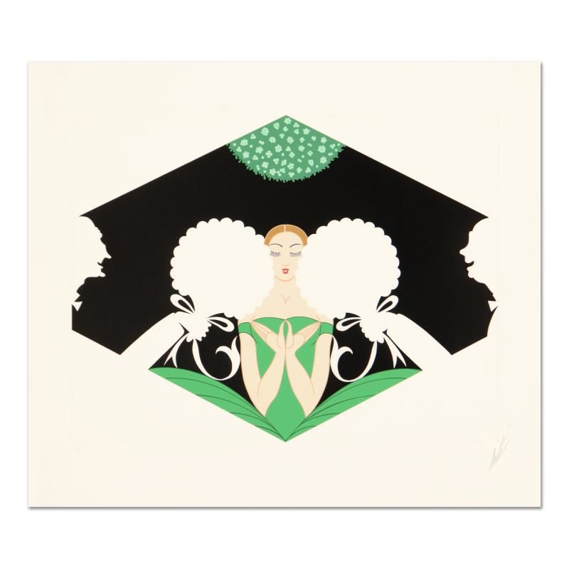 "The Suitors" is a limited edition serigraph on paper by Erte (1892-1990), numbered and hand signed by the artist. Includes Certificate of Authenticity. Measures approx. 18" x 15.5" (border), 15" x 11.5" (image). Due to the age of this piece and the delicate nature of the paper it may have some slight imperfections.