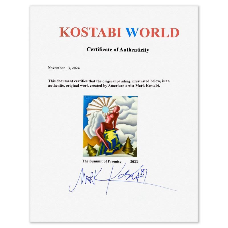 "The Summit of Promise" is an original oil painting on canvas by Mark Kostabi, hand signed by the artist. This piece comes framed. Includes Certificate of Authenticity. Measures approx. 22" x 20" (frame), 12" x 10" (image). This item requires special handling and may have a longer than usual turnaround.