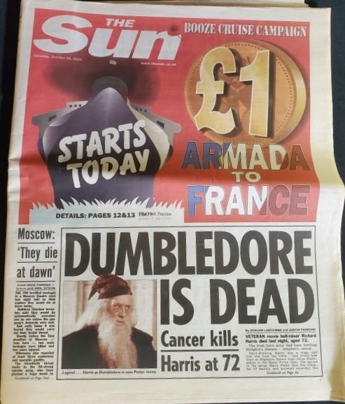 The Sun - Saturday October 26th 2002 announces Richard Harris ( Dunbledore ) passed at age 72.