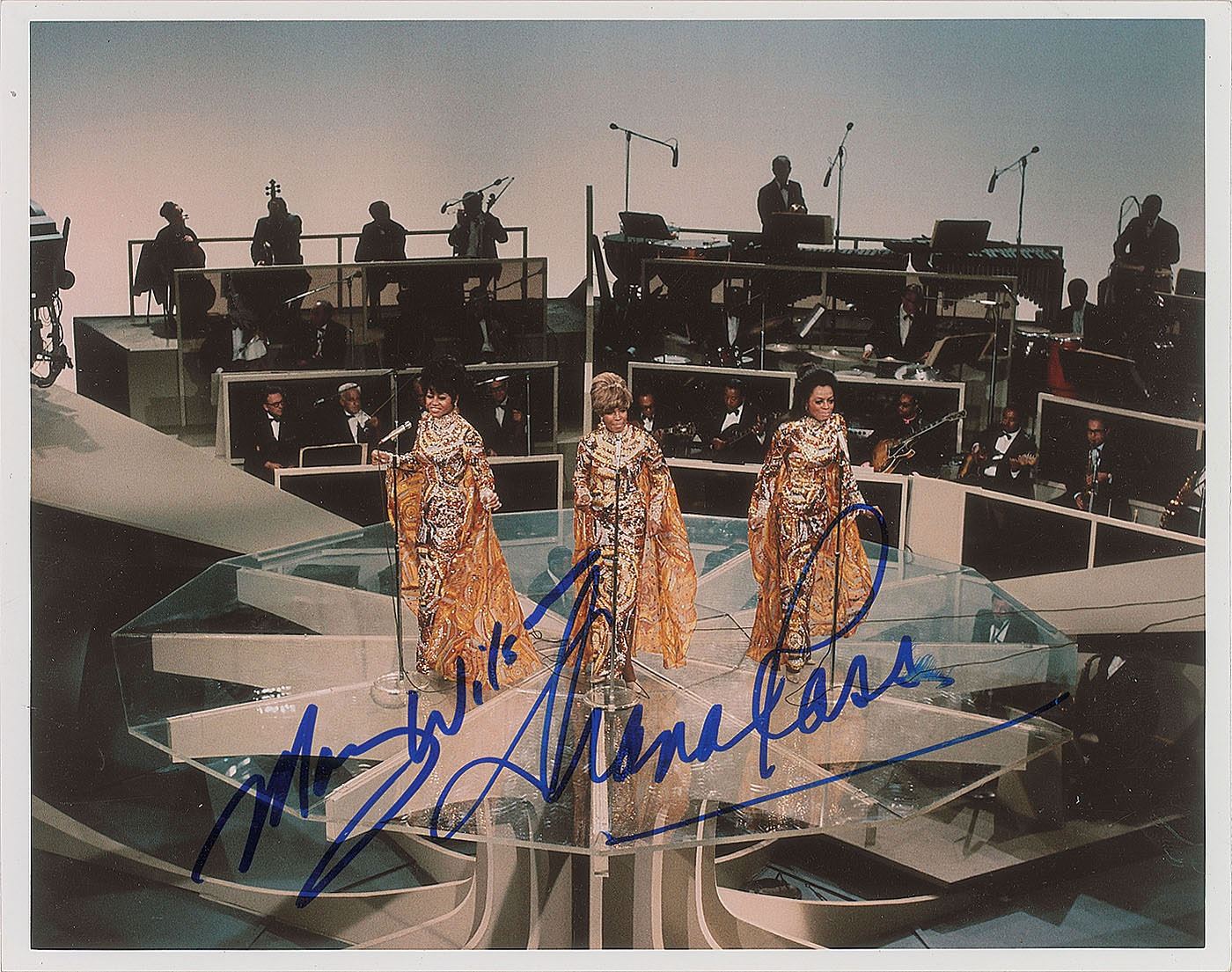 Color glossy 10 x 8 photo of the Supremes wearing elaborate golden dresses on a large transparent stage with backing orchestra, signed in blue felt tip by Diana Ross and Mary Wilson. In fine condition.