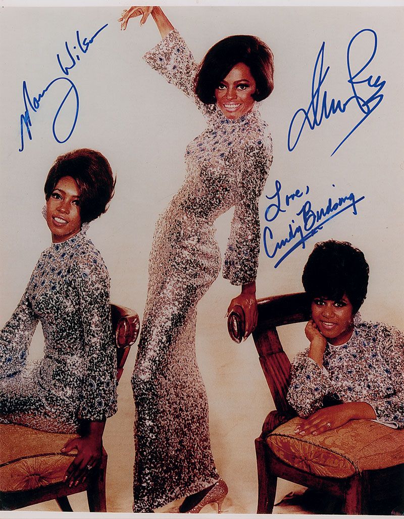 Color satin-finish 11 x 14 photo of the Supremes in dazzling gowns, signed in-person in blue felt tip by Diana Ross, Mary Wilson, and Cindy Birdsong. In fine condition, with a couple trivial brushes to the Wilson and Birdsong signatures. Originally obtained by in-person specialist Mike Wehrmann.