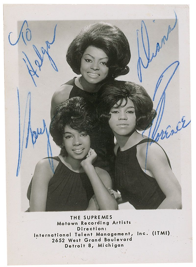 Vintage glossy 2.5 x 3.5 Motown publicity photo, signed in blue ballpoint by Diana Ross, Florence Ballard, and Mary Wilson, all using their first names only, and inscribed in the upper left “To Helga.” In fine condition.