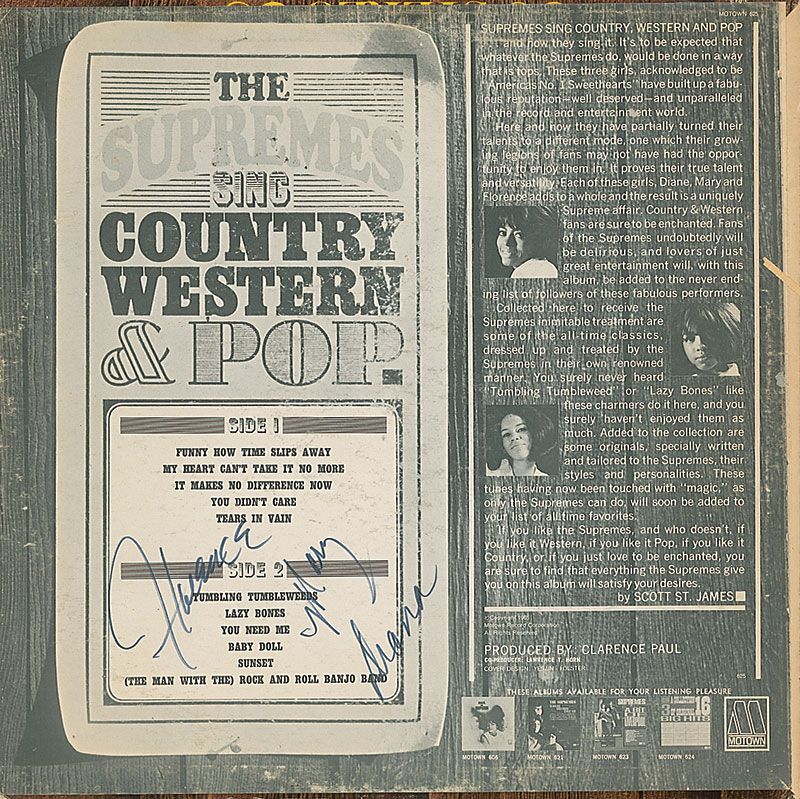 The Supremes Sing Country Western & Pop album signed on the back cover in black felt tip by Diana Ross, Mary Wilson, and Florence Ballard, all signing their first name only. In fine condition, with wear to edges. The record is included. Accompanied by a full letter of authenticity from Roger Epperson/REAL.