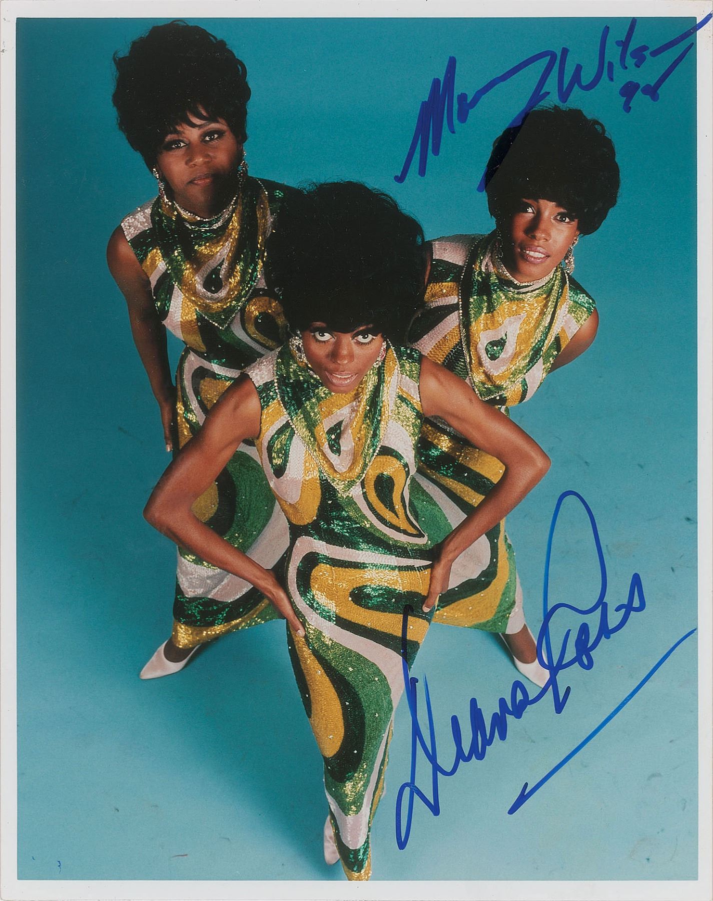 Color glossy 8 x 10 photo of the Supremes wearing elaborate sequin gowns, signed in blue felt tip, "Diana Ross" and "Mary Wilson, 94." In fine condition.