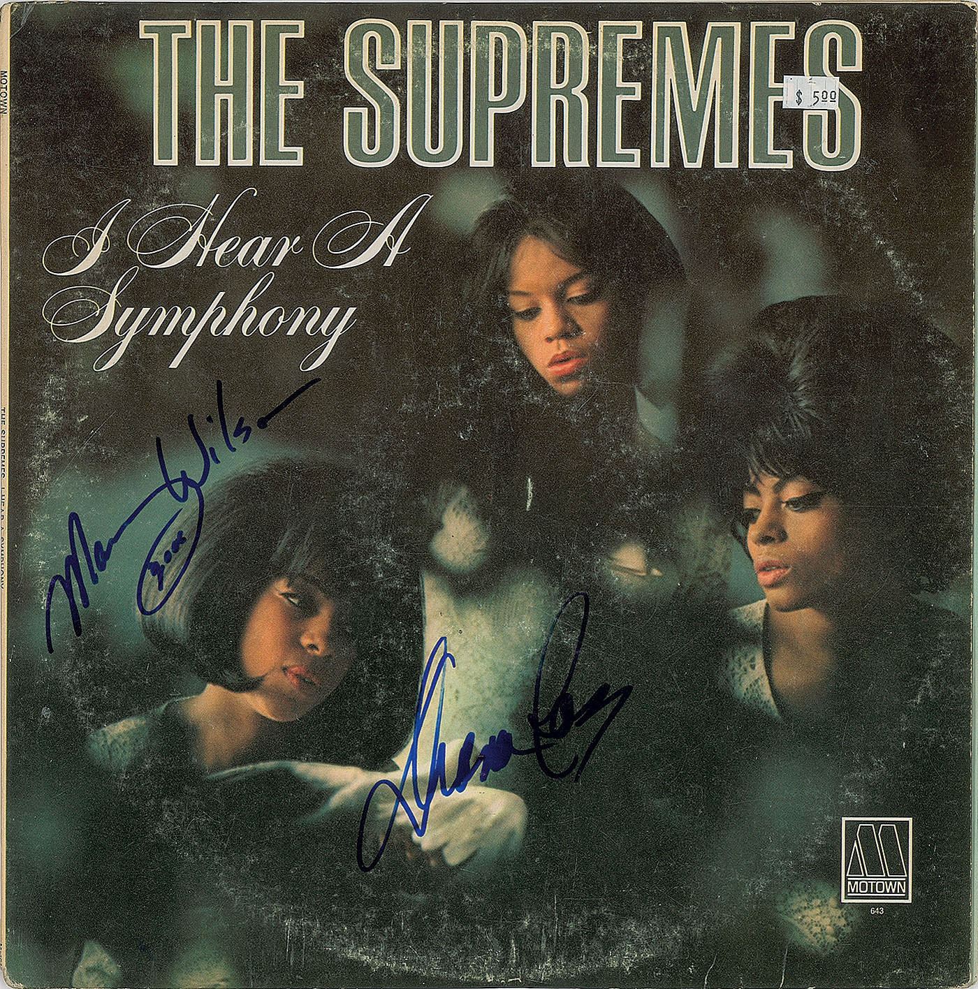 I Hear a Symphony album signed on the front cover in blue felt tip, "Diana Ross" and "Mary Wilson, 2006." In fine condition, with light scuffing and an affixed price sticker. The record is included.