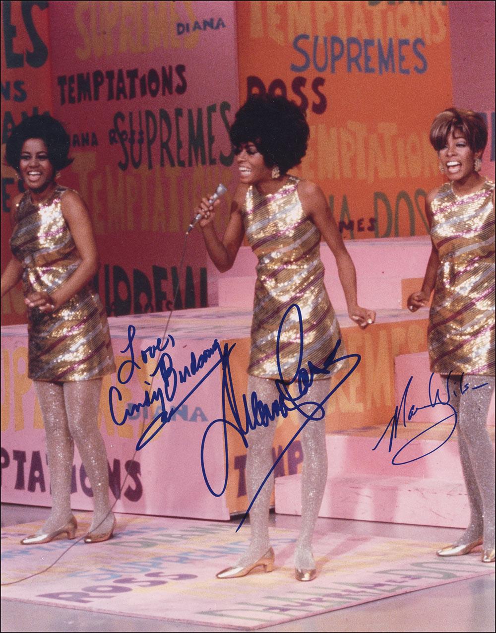 Color glossy 11 x 14 photo of the group performing, signed in blue felt tip by Diana Ross, Mary Wilson, and Cindy Birdsong. Originally obtained by in-person specialist Mike Wehrmann. In very fine condition. Pre-certified PSA/DNA and RRAuction COA.