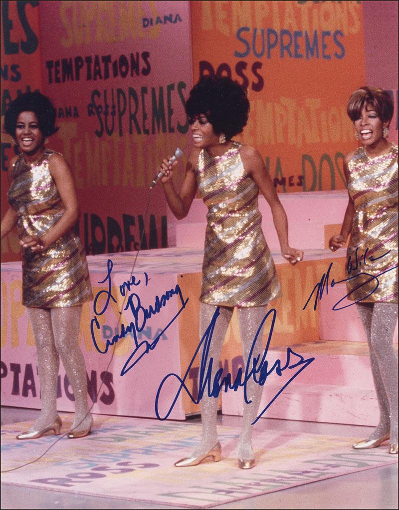 Color satin-finish 11 x 14 photo of the Supremes performing, signed in-person in blue felt tip by Diana Ross, Cindy Birdsong, and Mary Wilson. Originally obtained by in-person specialist Mike Wehrmann. In very fine condition.