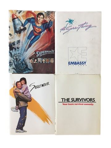 Collection of 4 press kits with black and white publicity stills included, sized mainly 8x10's from various movie studios (1980's). From Warner Brothers "Surrender" (1987) starring Sally Field as Daisy Morgan, Michael Caine as Sean Stein, and Steve Guttenberg as Marty, includes 4 stills. From Embassy Pictures "The Sure Thing" (1985) starring John Cusack as Walter Gibson, Daphne Zuniga as Alison Bradbury, and Nicollette Sheridan as "The Sure Thing", includes 13 stills. From Warner Brothers "Superman 4 The Quest For Peace", starring Christopher Reed as Superman, Gene Hackman as Lex Luther, and Jackie Cooper as Perry White, includes 4 stills. From Columbia Pictures "The Survivors"(1983) starring Robin Williams as Donald, Walter Matthau as Sonny Paulson, and Jerry Reed as Jack Locke, includes 9 stills.