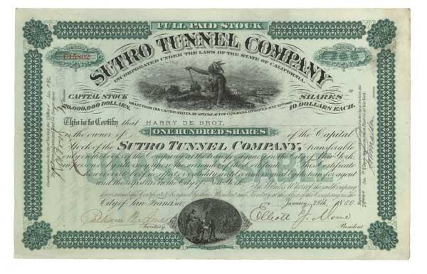 1880, California. Stock certificate for ten shares. GreenBlack. Engraved vignette at top center of a seated Indian warrior overlooking mining operations, boats and trains; smaller vignette of miners at work below. Adolph Sutro (1830 - 1898), a mining Engineer and eventually mayor of San Francisco formed the Sutro Tunnel Company to construct a tunnel which would provide ventilation, drainage and an easy means of transporting men and materials to and from the mines in the region of the Comstock Lode. The Sutro Tunnel was one of the 19th century's engineering marvels. Uncancelled and Extremely Fine.
