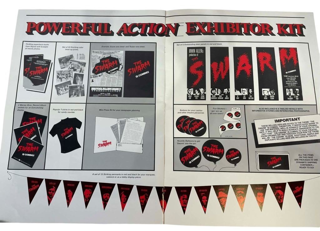 Original press screening folder from the Irwin Allen directed thriller film 'The Swarm' (1978), which follows a scientist and a military task force who try to prevent a large swarm of killer bees from invading Texas.
