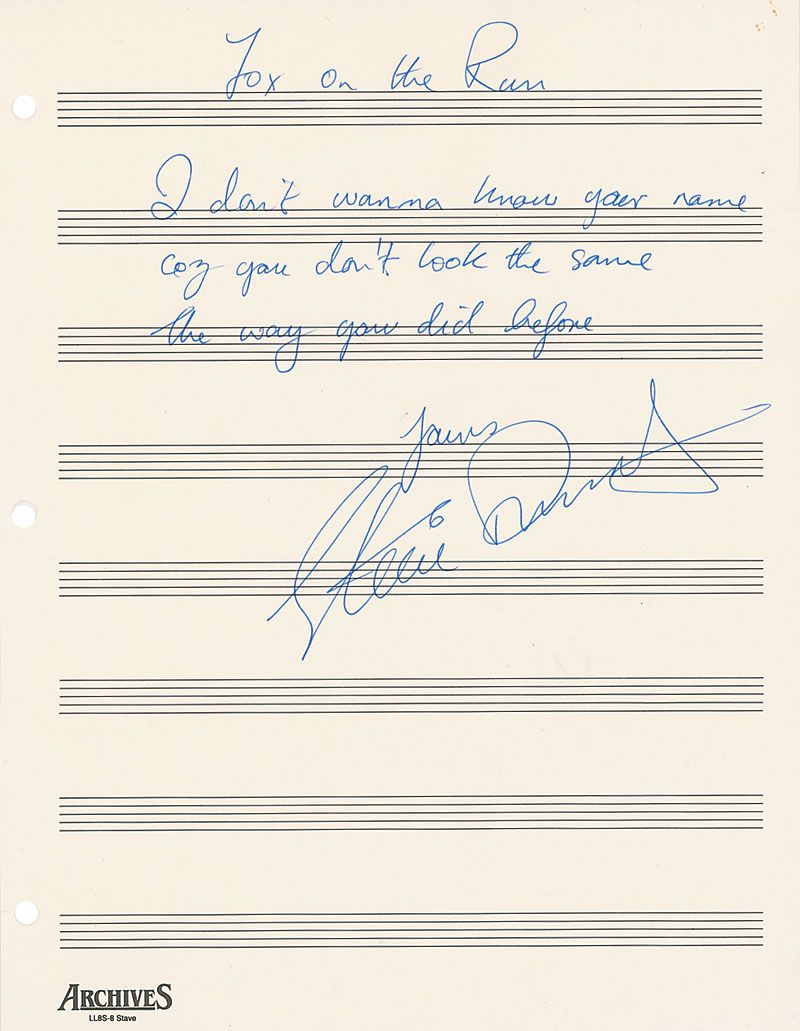 Souvenir handwritten lyrics on an off-white 8.5 x 11 musically-lined sheet. Priest writes out the opening to ‘Fox On the Run,’ “I don't wanna know your name, Cause you don't look the same; The way you did before,” and signed at the conclusion by Priest. In fine condition, with punch holes to left edge.