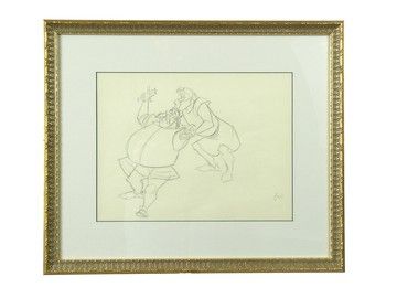 One of the great joys of the classic Disney animated feature "The Sword In The Stone" (1963), was the comic relief of father and son buffoons, Sir Kay and Sir Ector. This is a large pencil production animation drawing of the two, in one of their classic moments: son keeping his drunk and cowardly father from falling over! It includes the animator's initials. It is beautifully double matted, and encased in a gold painted frame. (Drawing is approx. 11"x9.5", gold frame is approx. 22.25" x 18.75" x 1".) Comes with a COA.
