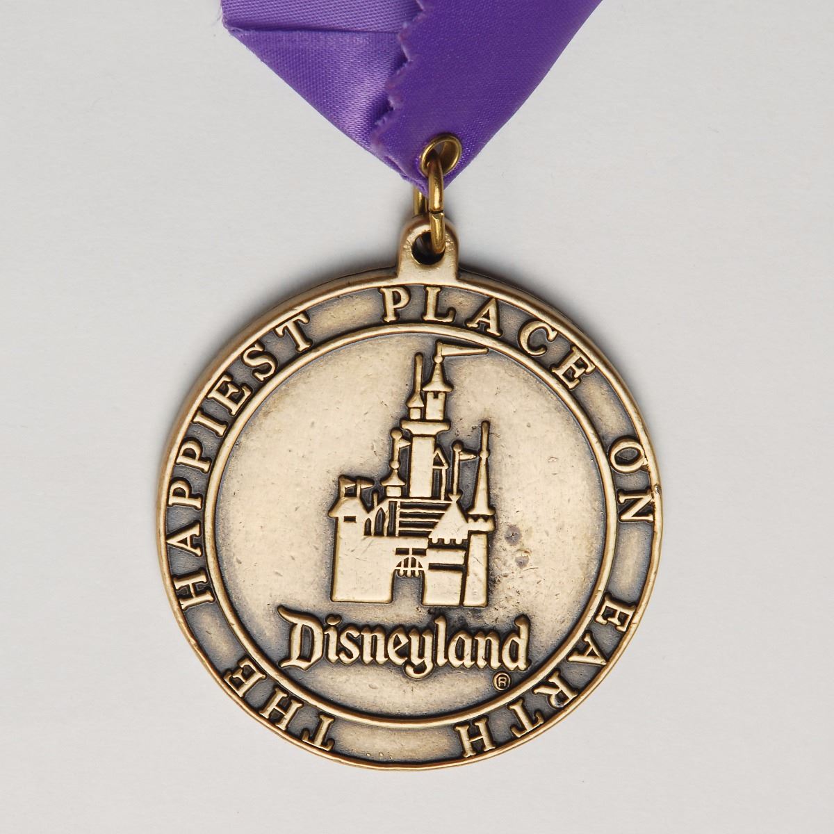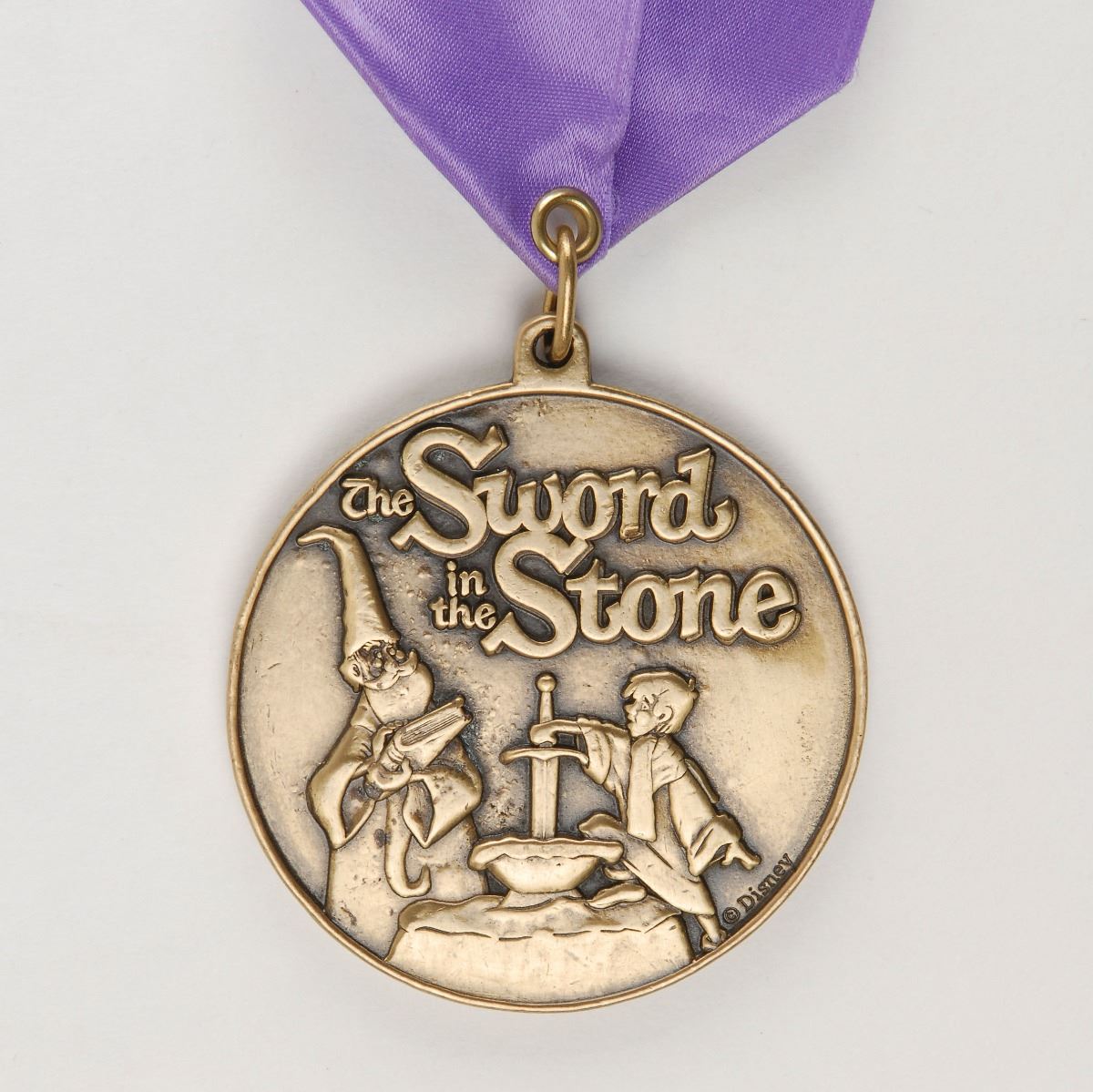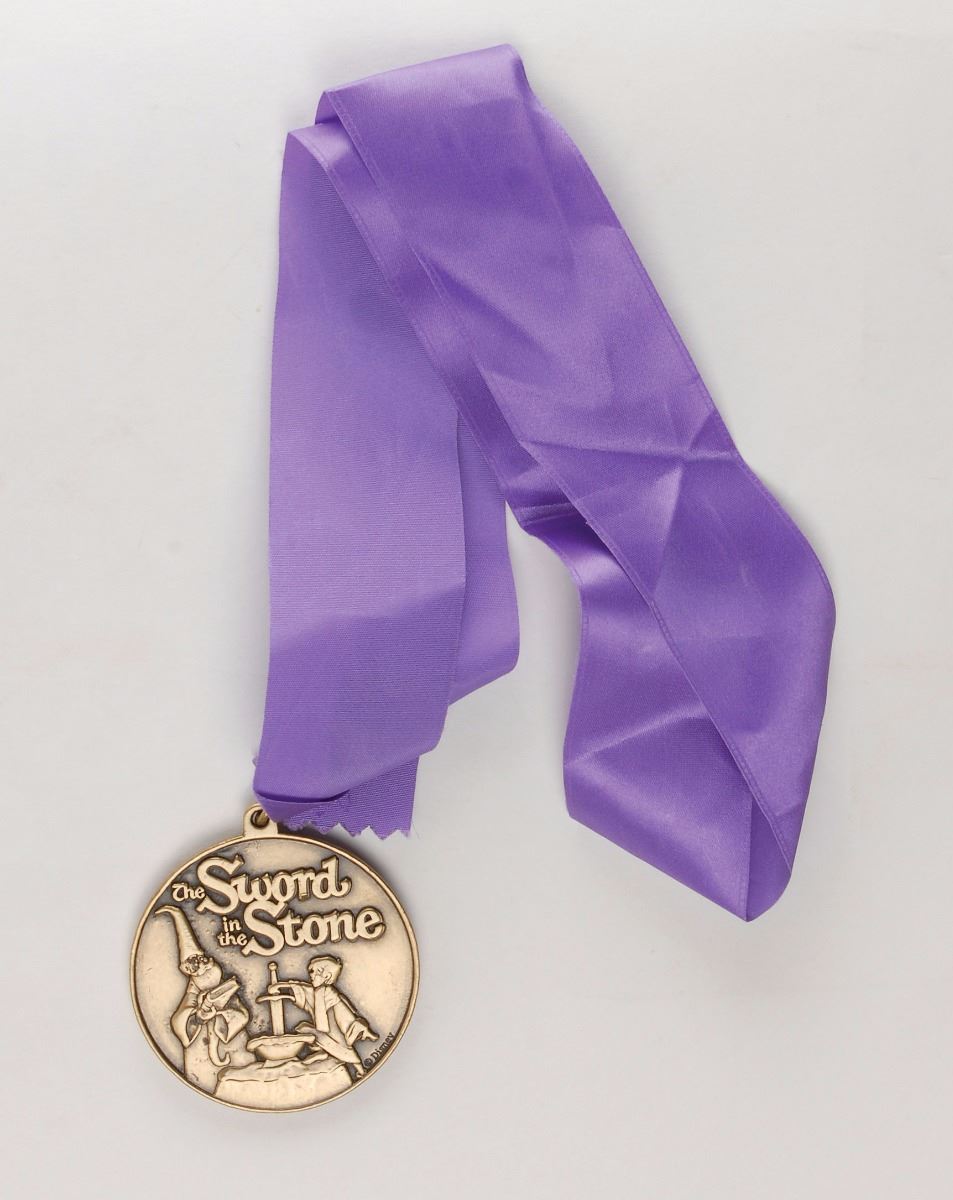 Scarce original Sword in the Stone presentation medal from Disneyland, measuring 2.5? in diameter, suspended from its original purple ribbon. The front features a raised image of Merlin and Arthur attempting to pull the sword from the anvil, and the reverse bears the Disneyland logo encircled with text, “The Happiest Place on Earth.” In fine condition. These medals were presented during a beloved Fantasy Land ceremony to a young volunteer at the park who would help Merlin remove the sword and be proclaimed ‘Ruler of the Realm.’ These medals from this now defunct ceremony were not available for sale at any of the parks and are now quite uncommon.