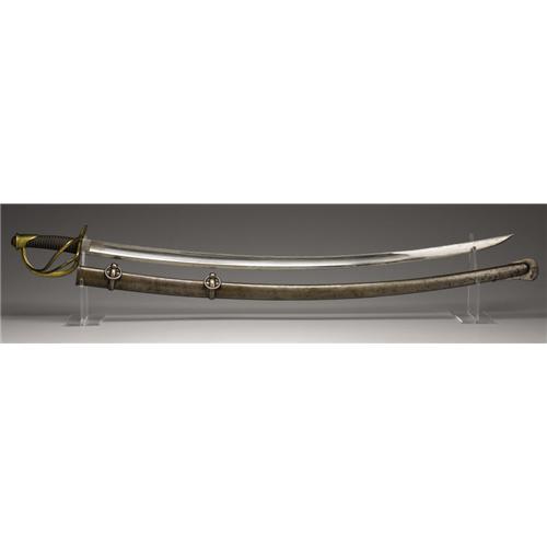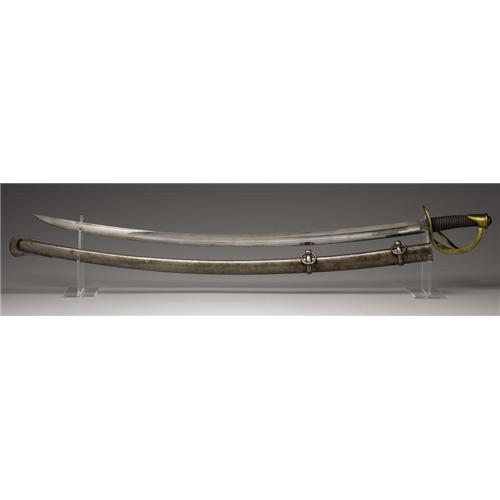 <B>The Sword of Confederate General Albert Sidney Johnston - Accompanied by an Oil Painting of Johnston</B></I> This 1840 Model Ames Cavalry Saber was carried by Confederate General Albert Sidney Johnston at the beginning of the Civil War. With a very nice gilt guard, this is a superb high-grade officer's sword made by the Ames Manufacturing Company of Chicopee, Massachusetts. Albert Sidney Johnston, an 1826 graduate of the United States Military academy at West Point, was already an accomplished and famous soldier by the time of the Civil War. A veteran of the Black Hawk War, a general in the Army of the Republic of Texas and a Colonel in the Mexican War, he was a Brigadier General at the outbreak of the Civil War. Offered a position in the United States Army as second in command to General Winfield Scott, he instead accepted a commission as a General in the Confederate Army. He was killed at the Battle of Shiloh with the entire Confederacy mourning his loss. Indeed Confederate President Jefferson Davis said he was, "the greatest soldier, the ablest man, civil or military, Confederate or Federal, then living."<BR> This 36" saber is in magnificent condition, the 1 1/4" wide blade with the 26" fuller, it is stamped 'US/H.D.K.' at the ricasso with 'Ames Mfg/Chicopee Mass/1853 on the reverse ricasso above the intact leather washer. The hilt is highly gilded with a 4" leather grip having 18 turns of gilt twisted 20 gauge brass wire with 13 twists per inch. The pommel cap has the inspectors' marks of 'A.D.K.' and 'J.W.R.'. The three-branch knuckle-bow adds weight to the sword which helped it earn the nickname "Old Wristbreaker".<BR> The scabbard is made of sheet steel and has two mounts at 3" and 11" down the scabbard with 1" rings. The 4" drag is stamped with the inspector's mark of 'J.W.R.' with the overall patina of the scabbard being a rich medium gray.<BR> The sword and scabbard are accompanied by a beautiful oil on canvas painting by T. R. Goldsworthy and David Heslep that commemorates Johnston's military career. Measuring 42" x 42", the central figure of Albert Sidney Johnston in his Confederate General's uniform is surrounded by vignettes of his actions during the Texas War for Independence, The Mexican War, as a Colonel in the United States Cavalry in the West and finally a scene depicting his death at the Battle of Shiloh during the Civil War. This sword is featured in the painting just below the image of Johnston and above the title of the picture 'Albert Sidney Johnston, 1803-1862'. The painting is nicely framed in a 2" oak frame.<BR> This is an historical sword and scabbard owned and used by an illustrious American military hero who was killed at the Battle of Shiloh, truly one of a kind in every way.<BR><BR><b>Shipping:</b> Requires 3rd Party Shipping (<a target="_blank" href="http://www.heritageauctions.com/common/shipping.php">view shipping information</a>)