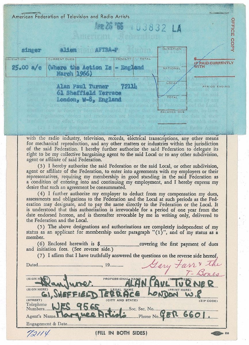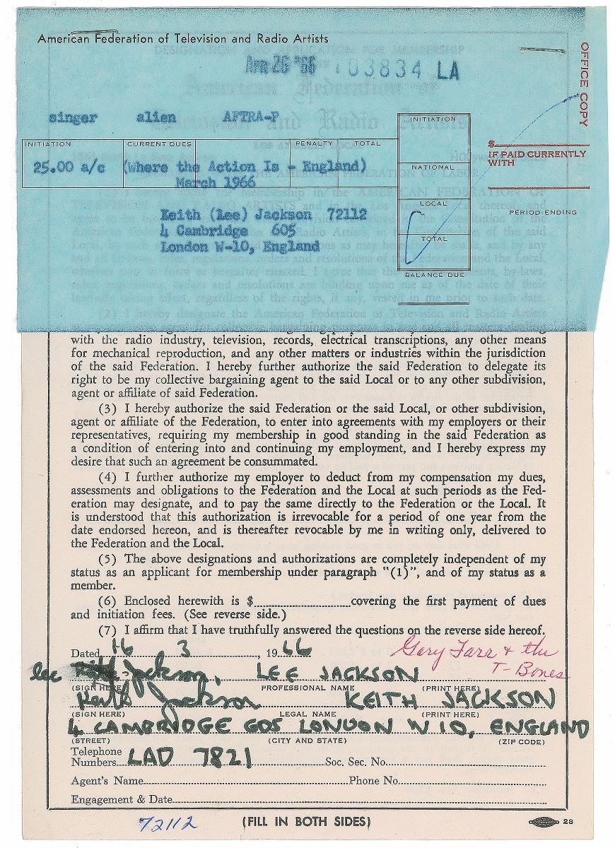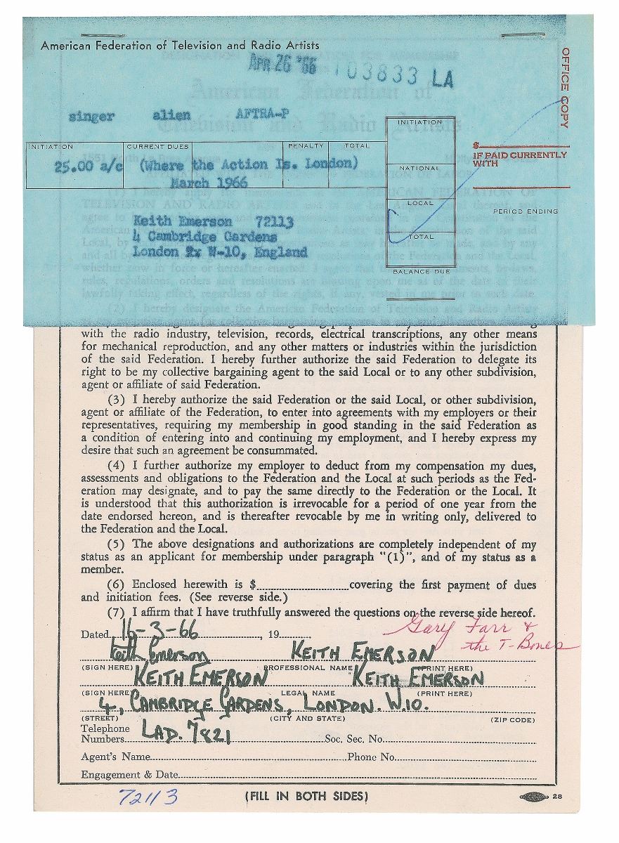 Four standard AFTRA membership applications, filled out and signed by T-Bones members Keith Emerson, Lee Jackson, Alan Turner, and David Langston, each one page, 6 x 8.75, dated April 26, 1966. In overall fine condition.