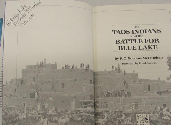 The Taos Indians and the Battle for Blue Lake by R. C. Gordon-McCutchan, Foreword by Frank Water, signed by author, measures approx. 10'' x 7''. SHI $15.