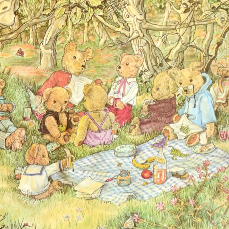 "The Teddy Bears Picnic" is a limited edition lithograph on paper, hand signed by Susan Anderson. Includes Letter of Authenticity. Measures approx. 21.5" x 18.5" (border), 18.5" x 13" (image).