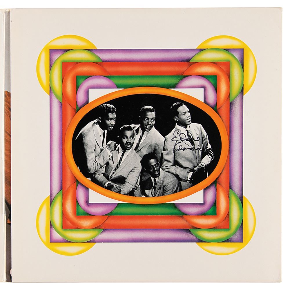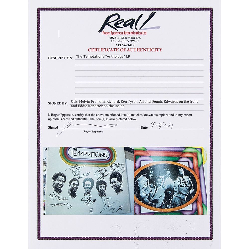 Anthology: The Temptations greatest hits album signed on the front cover in black felt tip by Melvin Franklin, Otis Williams, Dennis Edwards, Ron Tyson, Richard Street, and Ali-Ollie Woodson, with each adding variations of the band name. In fine condition. The records are included.