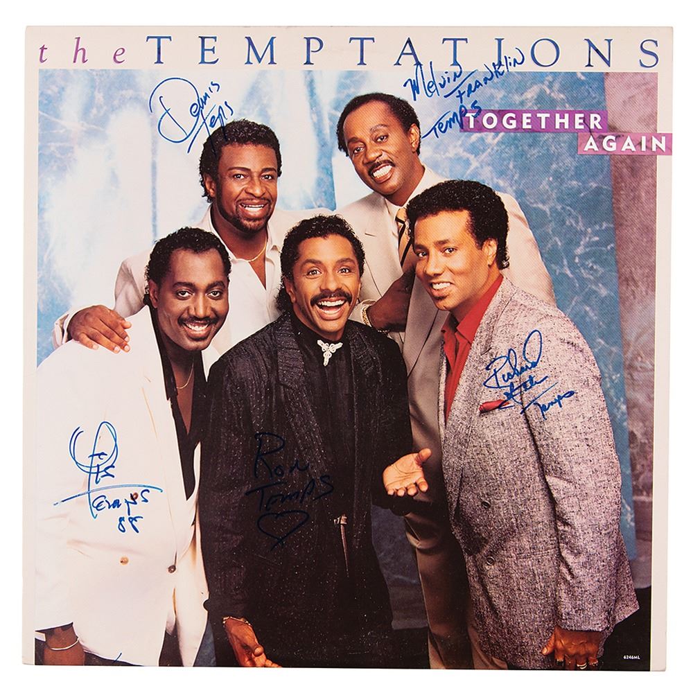 Together Again album by The Temptations, signed on the front cover in blue felt tip by Melvin Franklin, Otis Williams, Dennis Edwards, Ron Tyson, and Richard Street, with each adding “Temps.” In very fine condition. The record is included.