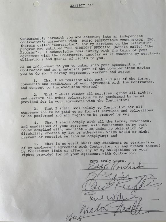 The Temptations signed contract autographed by Eddie Kendricks, Otis Williams, David Ruffin, Paul Williams and 9x12 inches. DB660