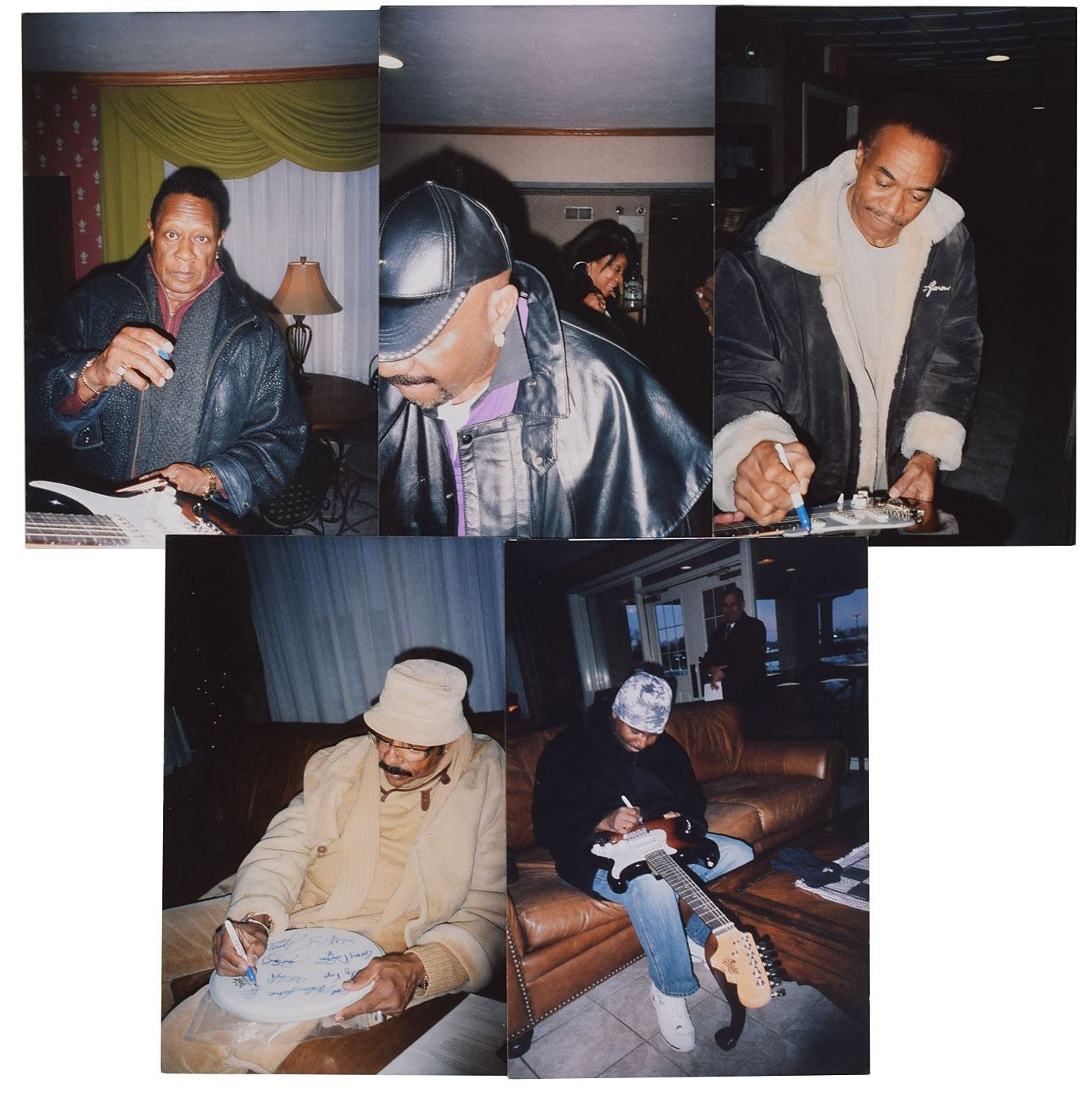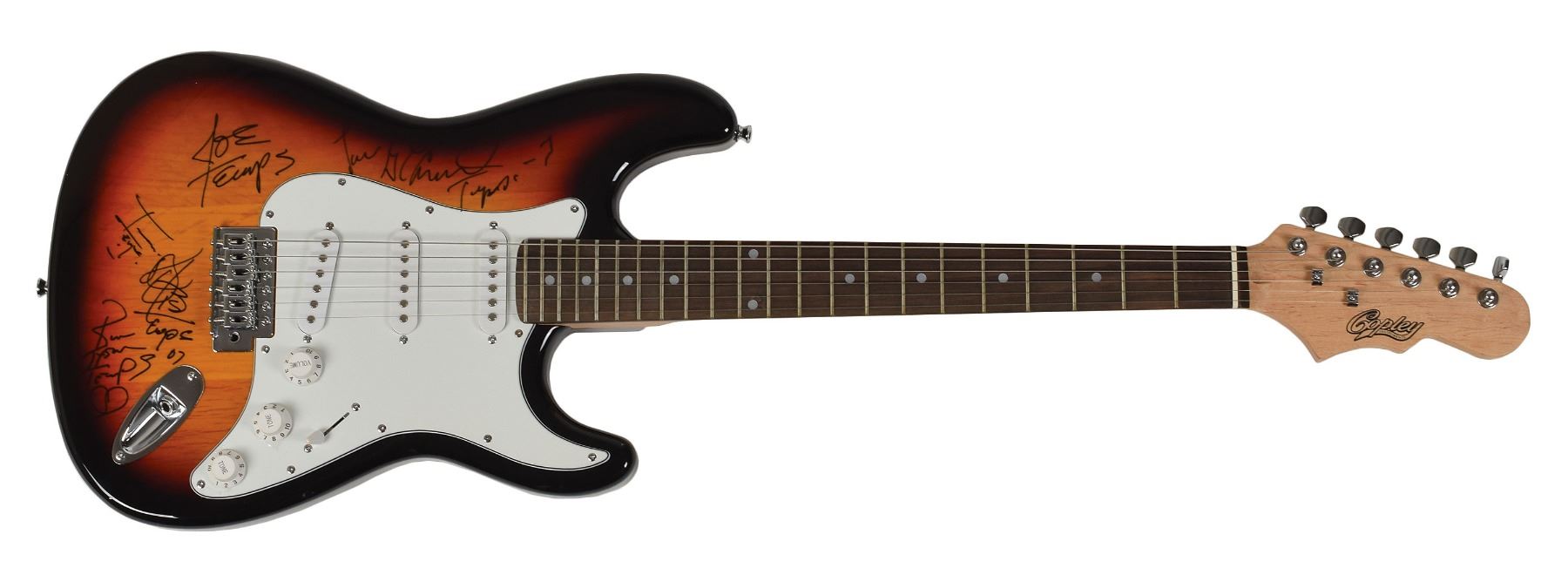 Attractive black-bodied sunburst-finish Copley ‘stratocaster-style’ electric guitar, signed on the body in felt tip by Otis Williams, Ron Tyson, Joe Herndon, G. C. Cameron, and Terry Weeks. Includes an SX gig bag. In fine condition. Accompanied by photos of the band members taken at the time of signing.