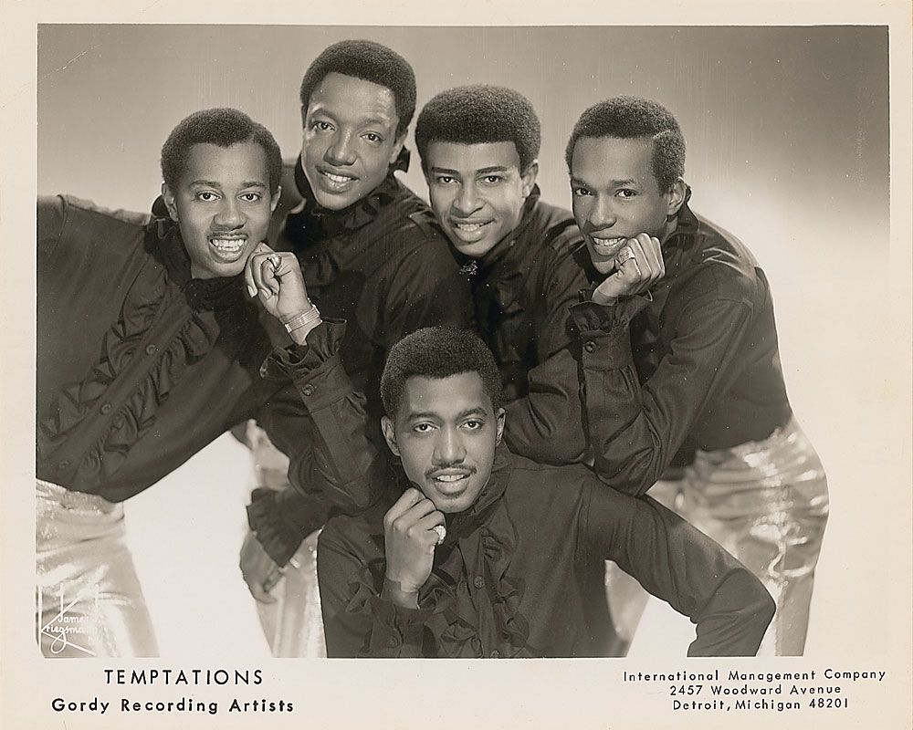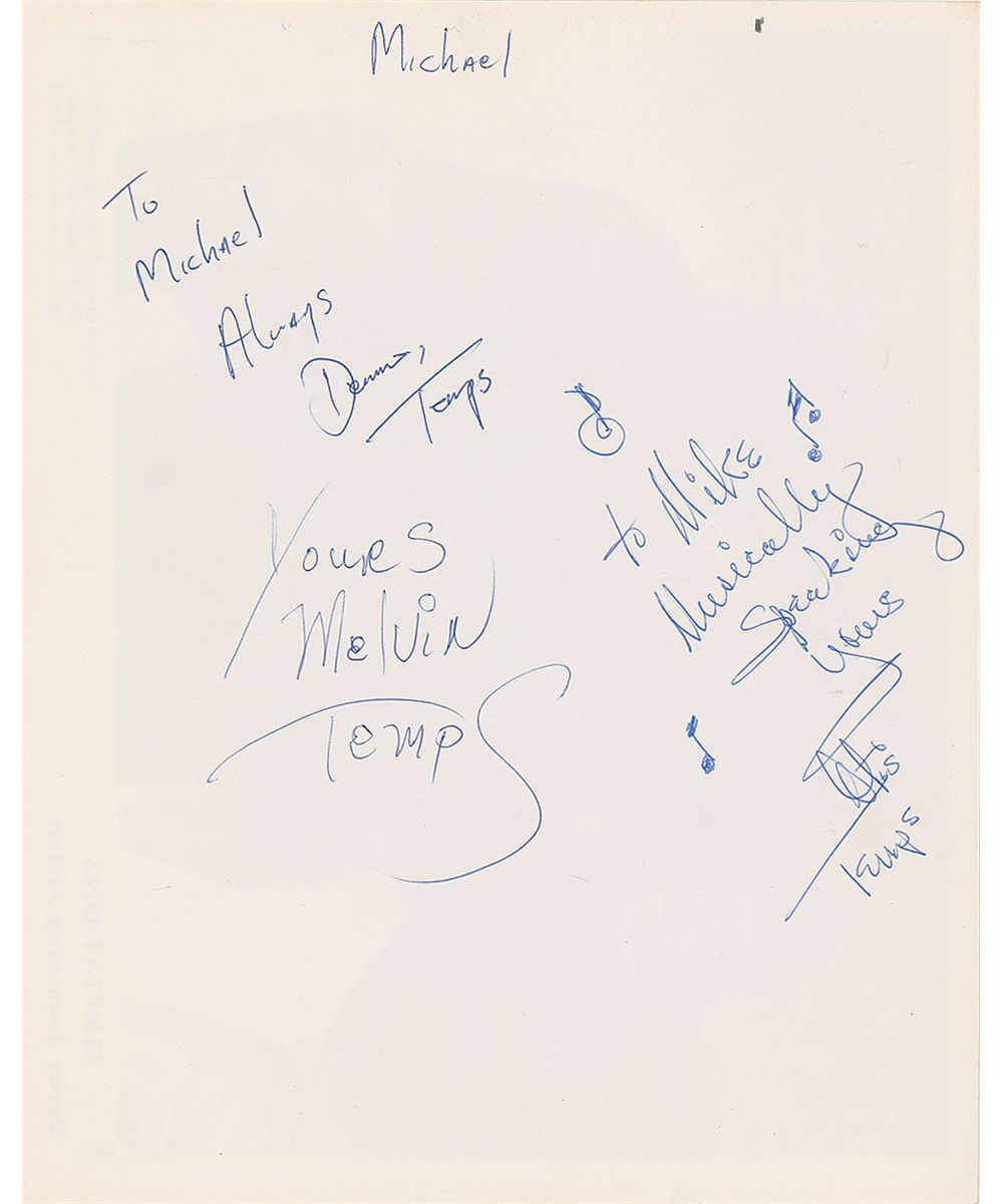 Glossy 10 x 8 Gordy Recording Artists publicity photo, signed and inscribed on the reverse in blue ballpoint, “To Michael, Always, Dennis, Temps,” “To Mike, Musically speaking yours, Otis, Temps,” “Yours, Melvin, Temps.” A noticeable crease to the upper left corner and a few scattered surface impressions, otherwise fine condition.