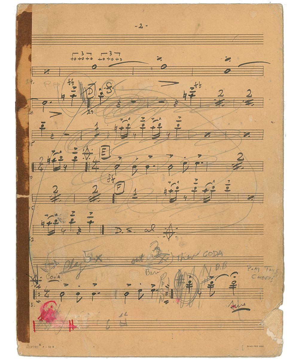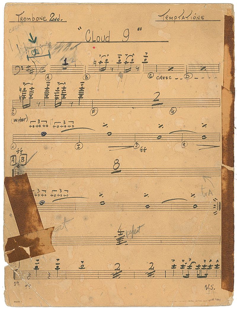 Original handwritten sheet music, two pages on two adjoining sheets, 9.5 x 12.5, to the second trombone section of ‘Cloud 9,’ used for the recording by Motown Records session musicians, The Funk Brothers. In good condition, with heavy creases, moderate toning, a few tears, various pieces of toned tape affixed throughout, and numerous original ink and pencil notations, made by The Funk Brothers. A fantastic piece of music history that demonstrates the flexibility and improvisation required throughout the recording process. Originates from the files of Motown musical director Cornelius Grant.