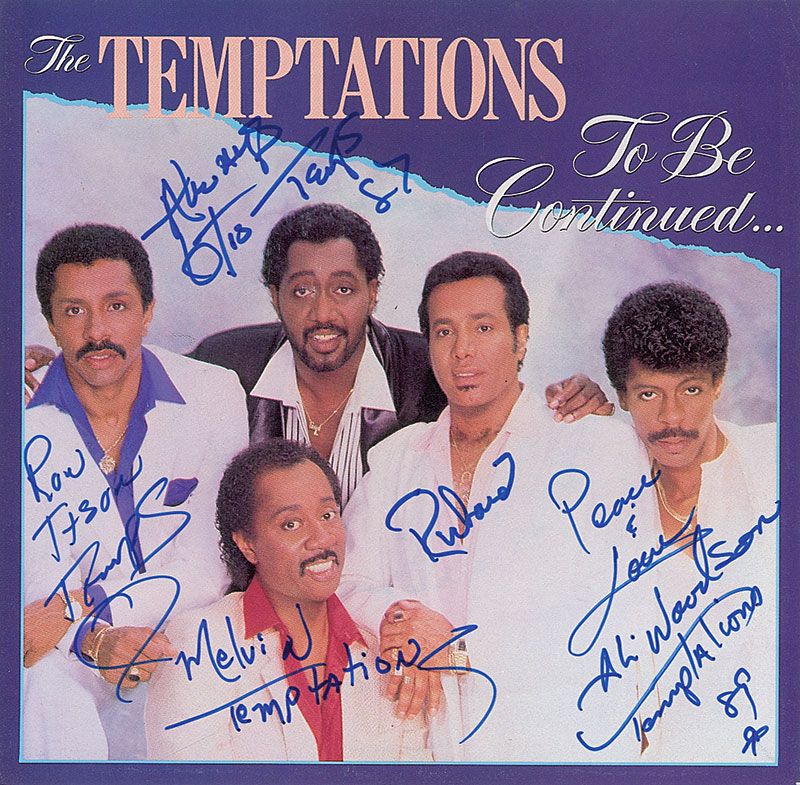 Color 45 rpm record sleeve for ‘To Be Continued,’ signed in blue felt tip by Otis Williams, Ron Tyson, Al Woodson, Melvin Franklin, and Richard Street. In fine condition. Accompanied by a full letter of authenticity from Roger Epperson/REAL.