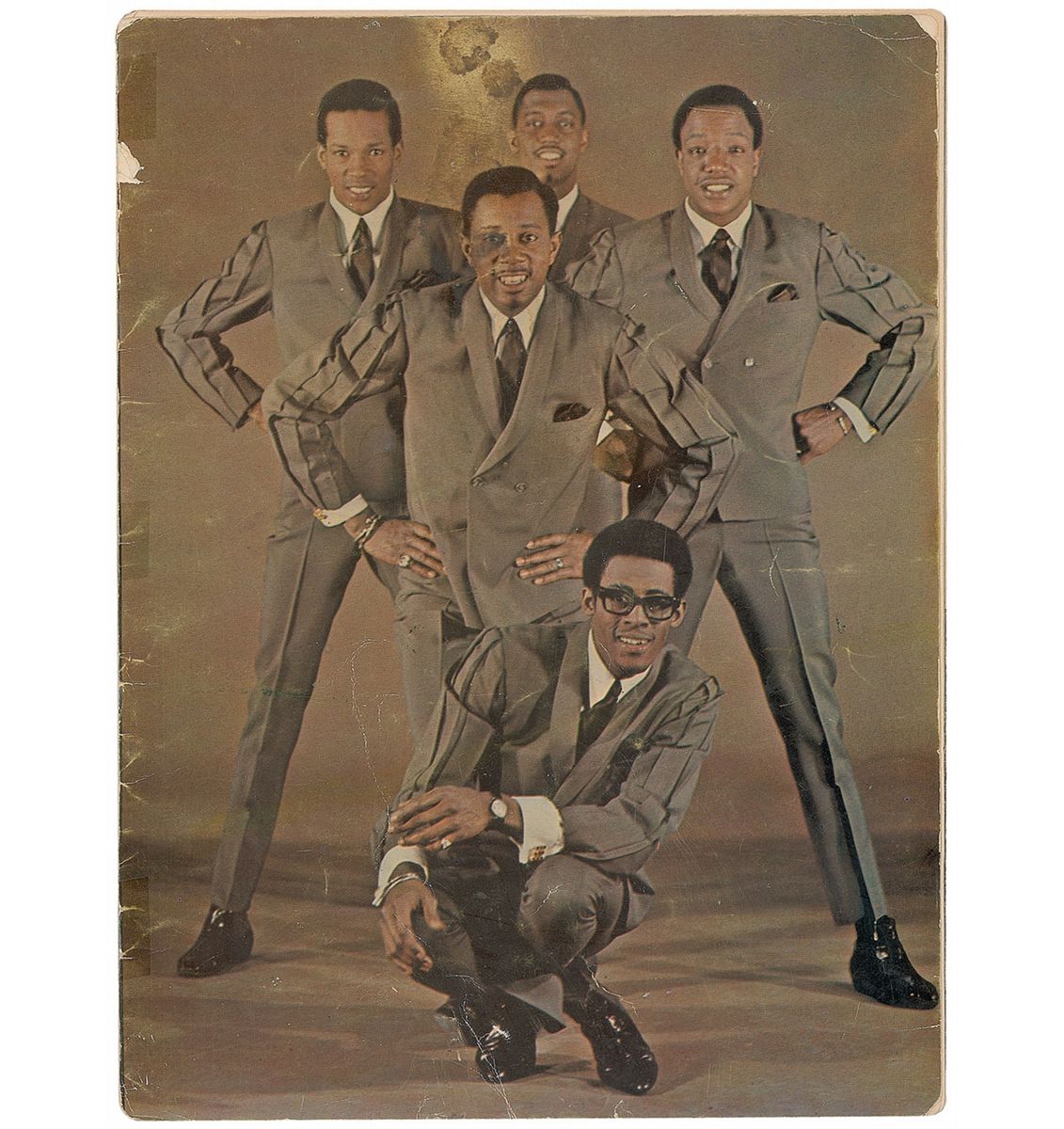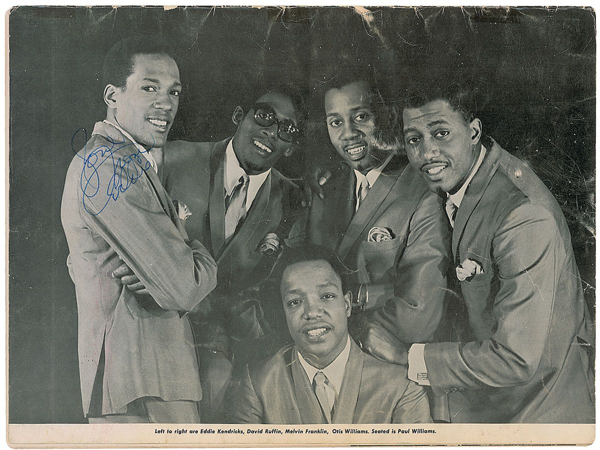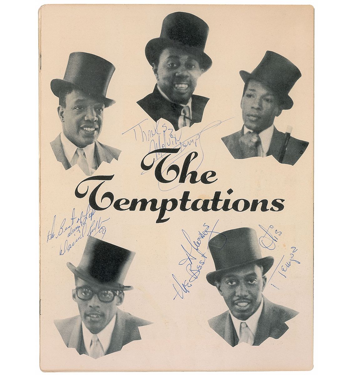 Program for the 1967 Temptations concert tour, 9 x 12, signed on the first page in blue ballpoint by David Ruffin, Melvin Franklin, and Otis Williams, and on the back cover by Eddie Kendricks, most signing with their first names only. In very good condition, with tape-repaired tears and spine separation to covers, and scattered creases and soiling to covers; the signed page is in fine condition. Group-signed items including Ruffin are quite uncommon, as he left the band in 1968.