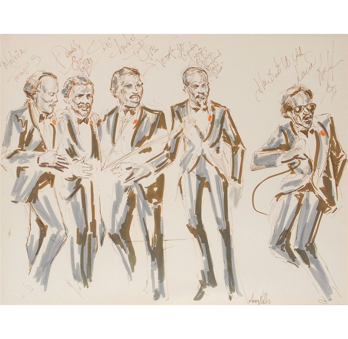 Lively felt tip sketch of the Temptations during a performance on an off-white 13.5 x 10.5 sheet, drawn by an artist named “Andy,” and signed at the top in felt tip by David Ruffin, Otis Williams, Melvin Franklin, Dennis Edwards, and Eddie Kendricks, with two adding inscriptions to the artist. Impressively custom double-matted and framed with a photo of the band and engraved nameplates to an overall size of 25 x 36. In fine condition. Temptations items including Ruffin are quite uncommon, as he left the band in 1968 and passed away in 1991. A large and visually appealing one-of-a-kind piece. Oversized.