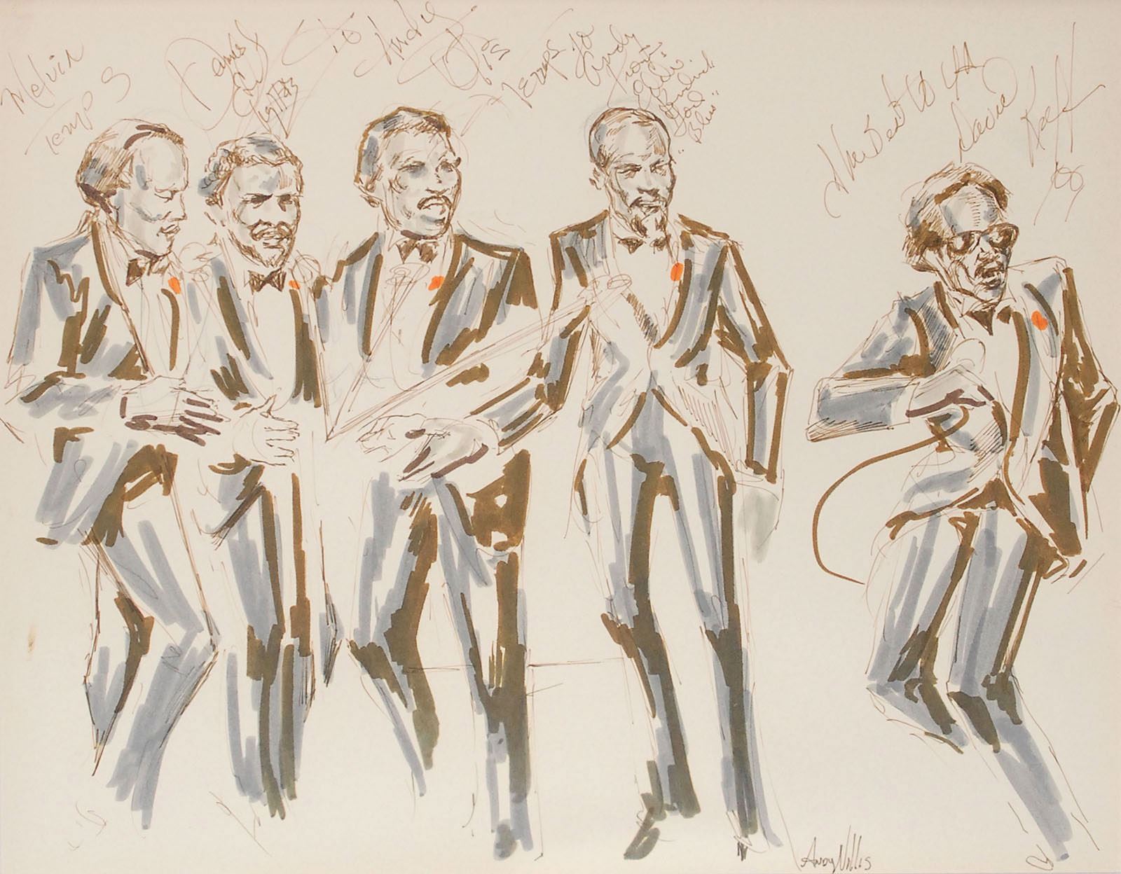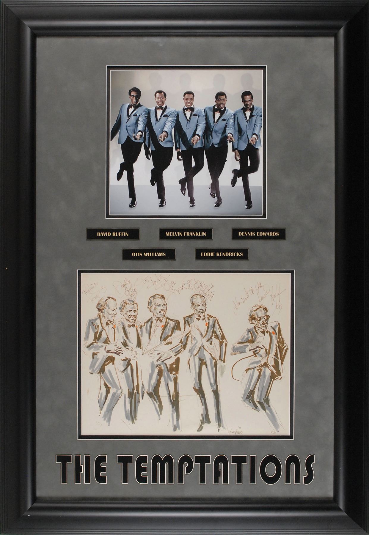 Lively felt tip sketch of the Temptations during a performance on an off-white 13.75 x 10.5 sheet, drawn by an artist named "Andy," and signed at the top in felt tip by David Ruffin, Otis Williams, Melvin Franklin, Dennis Edwards, and Eddie Kendricks, with two adding inscriptions to the artist. Impressively custom double-matted and framed with a photo of the band and engraved nameplates to an overall size of 24.5 x 35.5. In fine condition. Temptations items including Ruffin are quite uncommon, as he left the band in 1968 and passed away in 1991. A large and visually appealing one-of-a-kind piece.