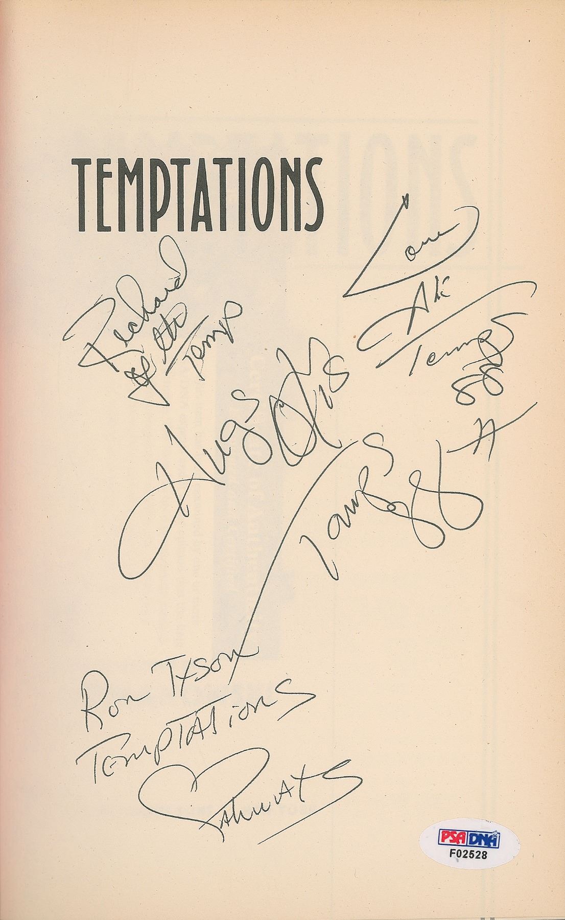 Signed book: The Temptations. First edition. NY: G. P. Putnam's Sons, 1988. Hardcover with dust jacket, 6.25 x 9.25, 240 pages. Signed on the half-title page in blank ink by Otis Williams, Ron Tyson, Richard Street, and Ali-Ollie Woodson, most signing with their first name only and adding the band's name and date. In fine condition, with a clipped corner to inner front dust jacket flap and a PSA/DNA label affixed to the signed page. Accompanied by a certificate of authenticity from PSA/DNA.
