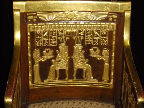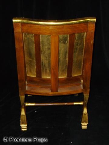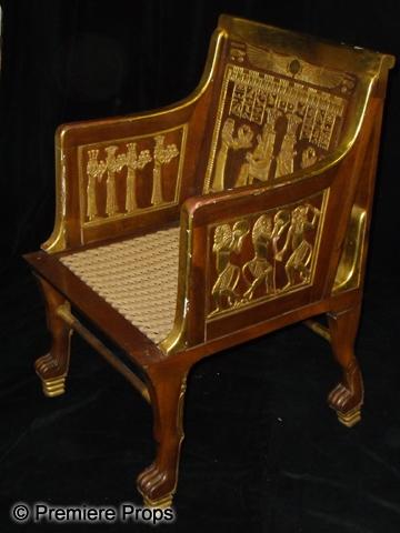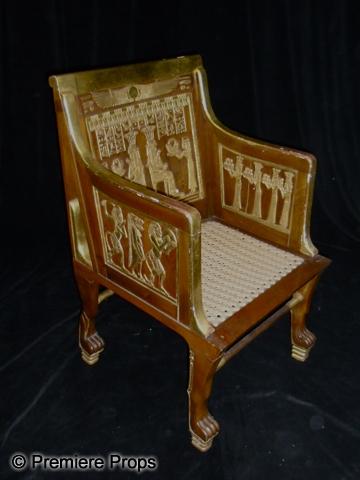 The Ten Commandments (1956) - A screen used Egyptian chair featured throughout the film. This is the double of the chair in the previous lot. Most likely the one from the scene where the chair is knocked over, this is the same chair except the back legs and cross bar are detached and it is missing the two ornamental pieces under either arm rest. The back legs and cross bar can easily be glued back into place. Acquired from a Paramount Studio sale in the early 1970's, the chair has been in private collection ever since. Believed to be built in the 1920's and used in other film productions. The chair was exhibited at the Huston Science Museum. 33" x 23" x 20". This item is oversized and will require additional shipping costs. Please email for shipping rates prior to bidding.