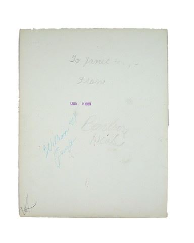 From the milestone and classic film, The Ten Commandments (1956) this is an extremely rare original test exposure proof photograph from Paramount Studios dated June 9, 1955 of Academy Award Winner Anne Baxter who played the character of Nefertari. This is an exquisite headshot taken by the famous director of photography Loyal Griggs and kept in the personal effects of the director Cecil B. DeMille. This photo was given to Doris Rothchilds a personal family friend of Cecil B. DeMille and was gifted to her by Cecilia DeMille in Southern California several decades ago. It is signed by Barbara Hicks who was the Secretary of the Publicity Department for the studio at the time of the release and her husband William W. Faught. Measures approximately 7 1/2" x 9 1/2".