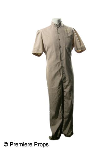 The Terminal Man (1974) - Richards (Jim Antonio) screen worn, custom made jumpsuit. It is a beige, short sleeve, snap button up, with pocket on the left chest . A "Babel" patch connects to velcro on the pocket. Written by Michael Crichton