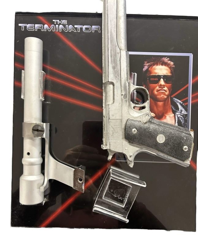 Original screen used 45 Longslide Handgun used by "The Terminator", played by Arnold Schwarzenegger in the James Cameron directed science fiction film "The Terminator" (1984) where a seemingly indestructible android is sent from 2029 to 1984 to assassinate a waitress, whose unborn son will lead humanity in a war against the machines, while a soldier from that war is sent to protect her at all costs.